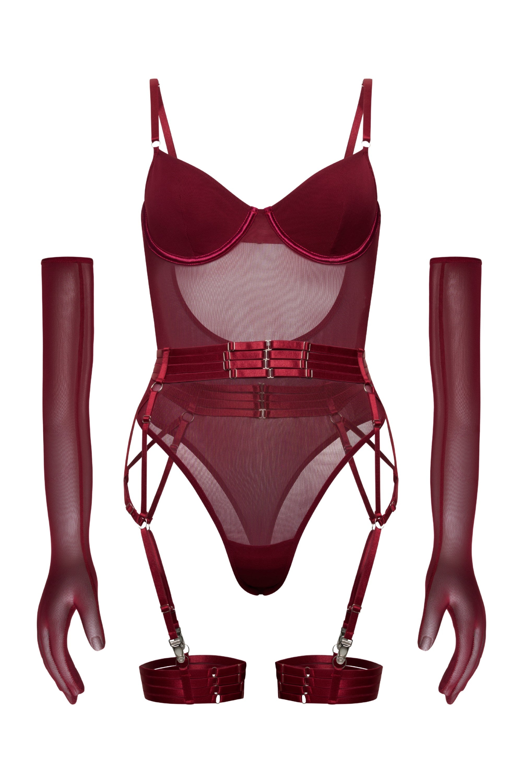 Eleganter Mesh-Body in Bordeaux mit Cups, mehrreihigem Hüftgurt und sichtbaren Strumpfhaltern, inklusive Armstulpen und Oberschenkelbändern – ein Statement-Look für besondere Abende