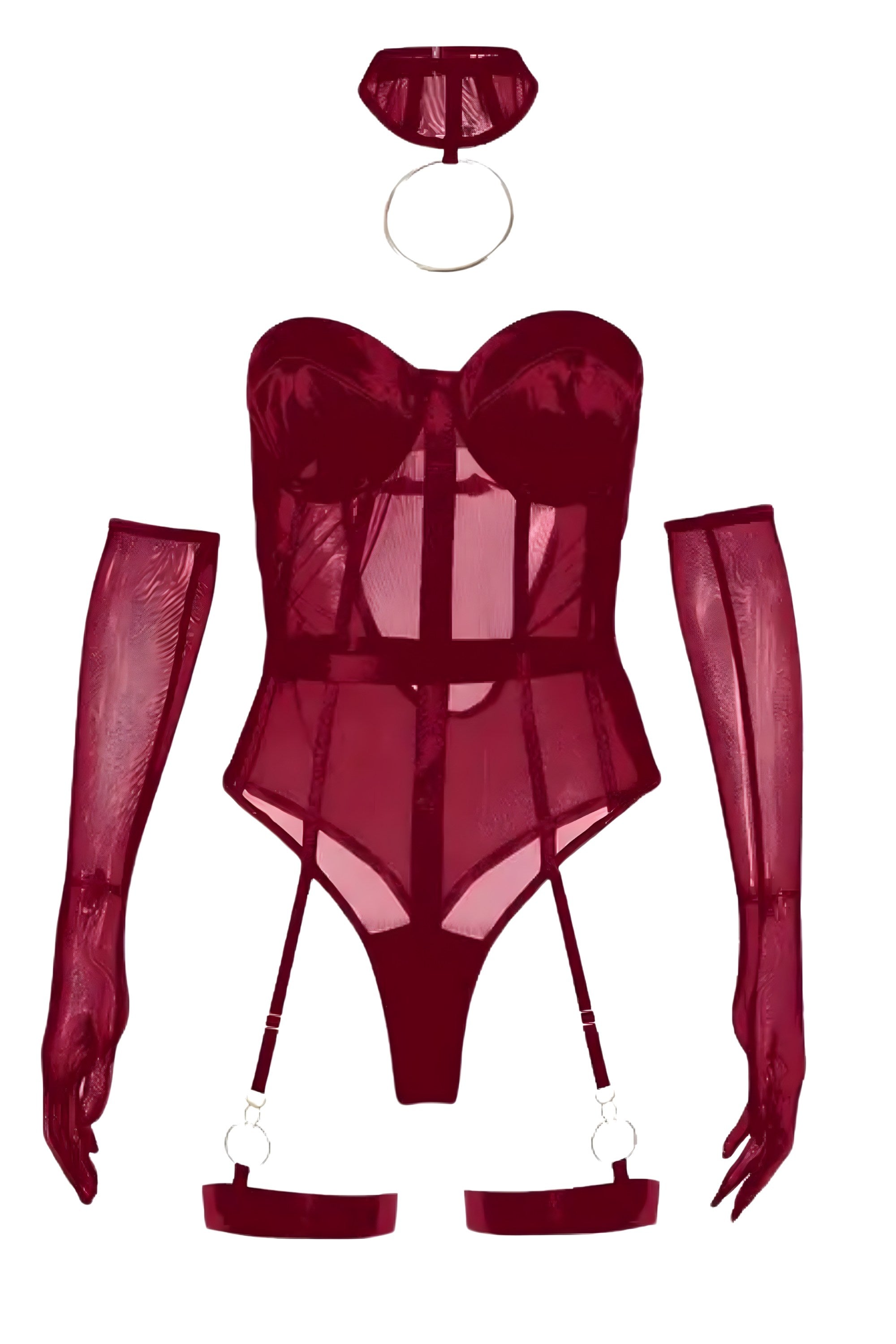 Transparenter Body in Weinrot mit formgebenden Nähten, Ring-Nackenband, langen Handschuhen und Strumpfhaltern an Oberschenkelbändern – stilvoll, figurbetont, modern.