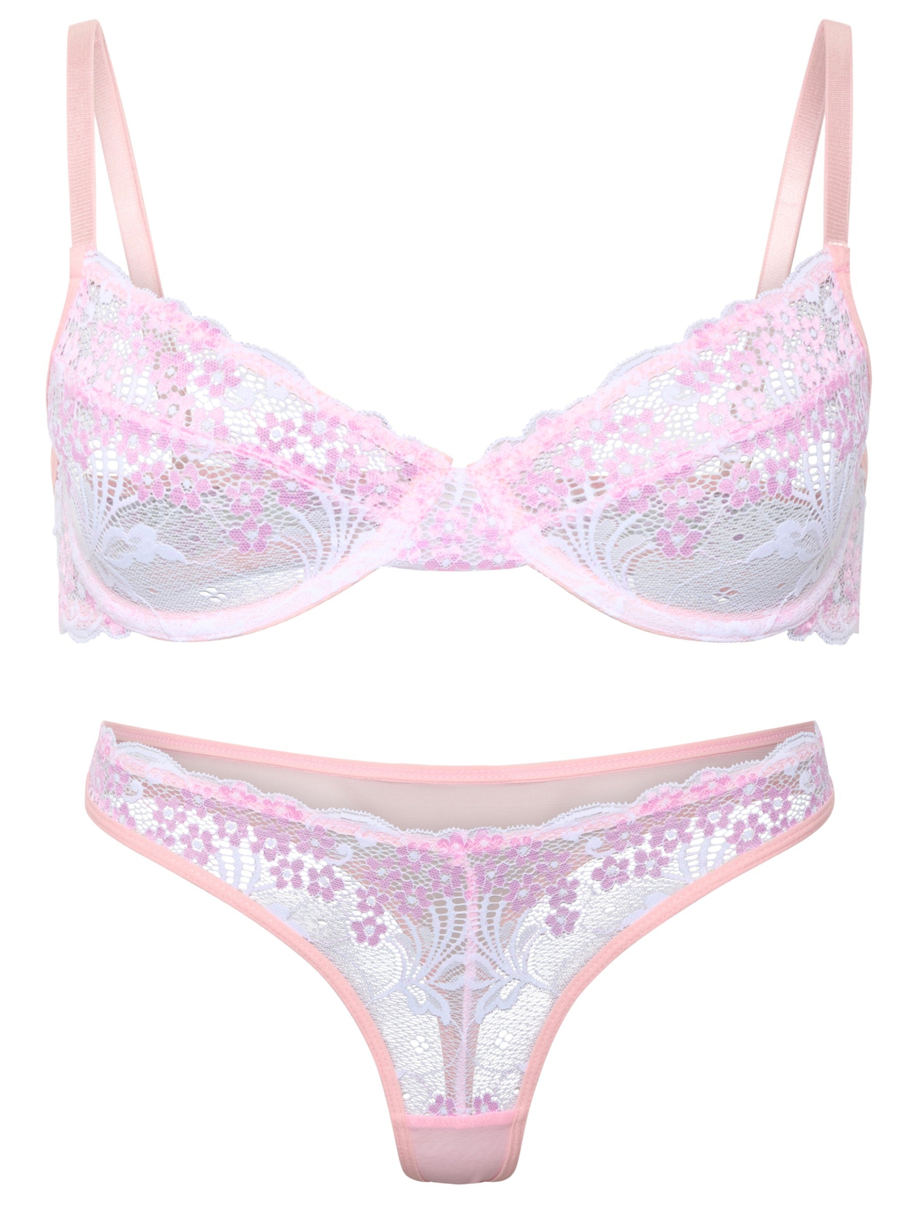 2-teiliges Dessous-Set in zartem Rosa: Balconette-BH mit floraler Spitze und passendem Tanga. Verstellbare Träger, feine Stickereien und luftige Transparenz für femininen Stil & hohen Komfort – ideal für besondere Anlässe und den Alltag.