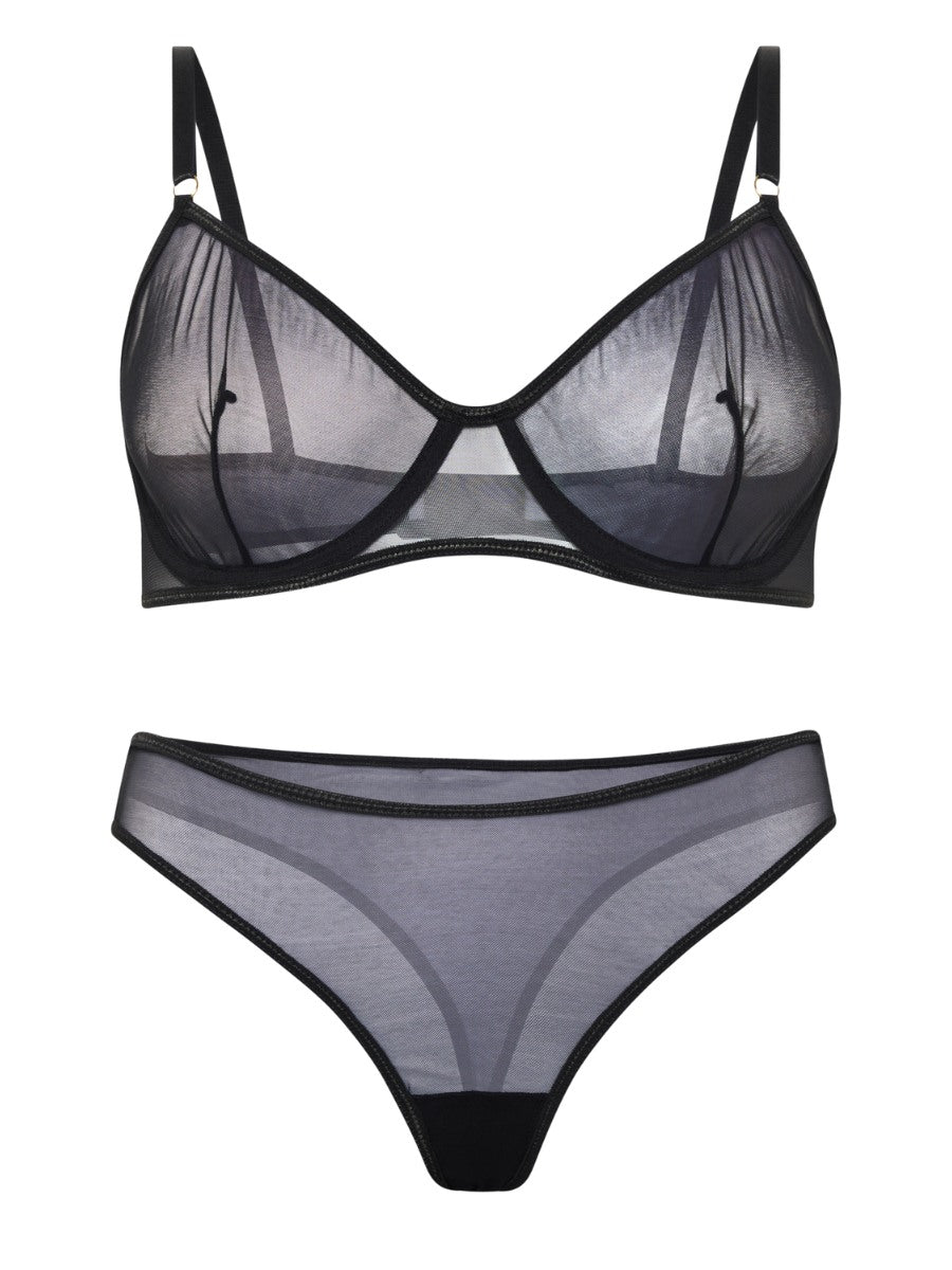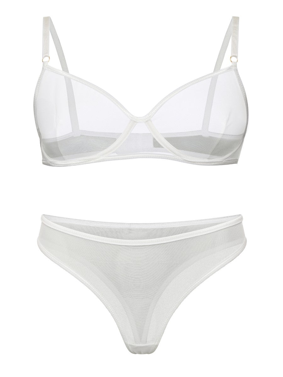 Luftiges Dessous-Set mit Bügel-BH für sanften Halt und passendem Tanga. Transparente Spitze und feine Details schaffen eine elegante Silhouette – perfekt für stilbewusste Momente mit einem Hauch Raffinesse.