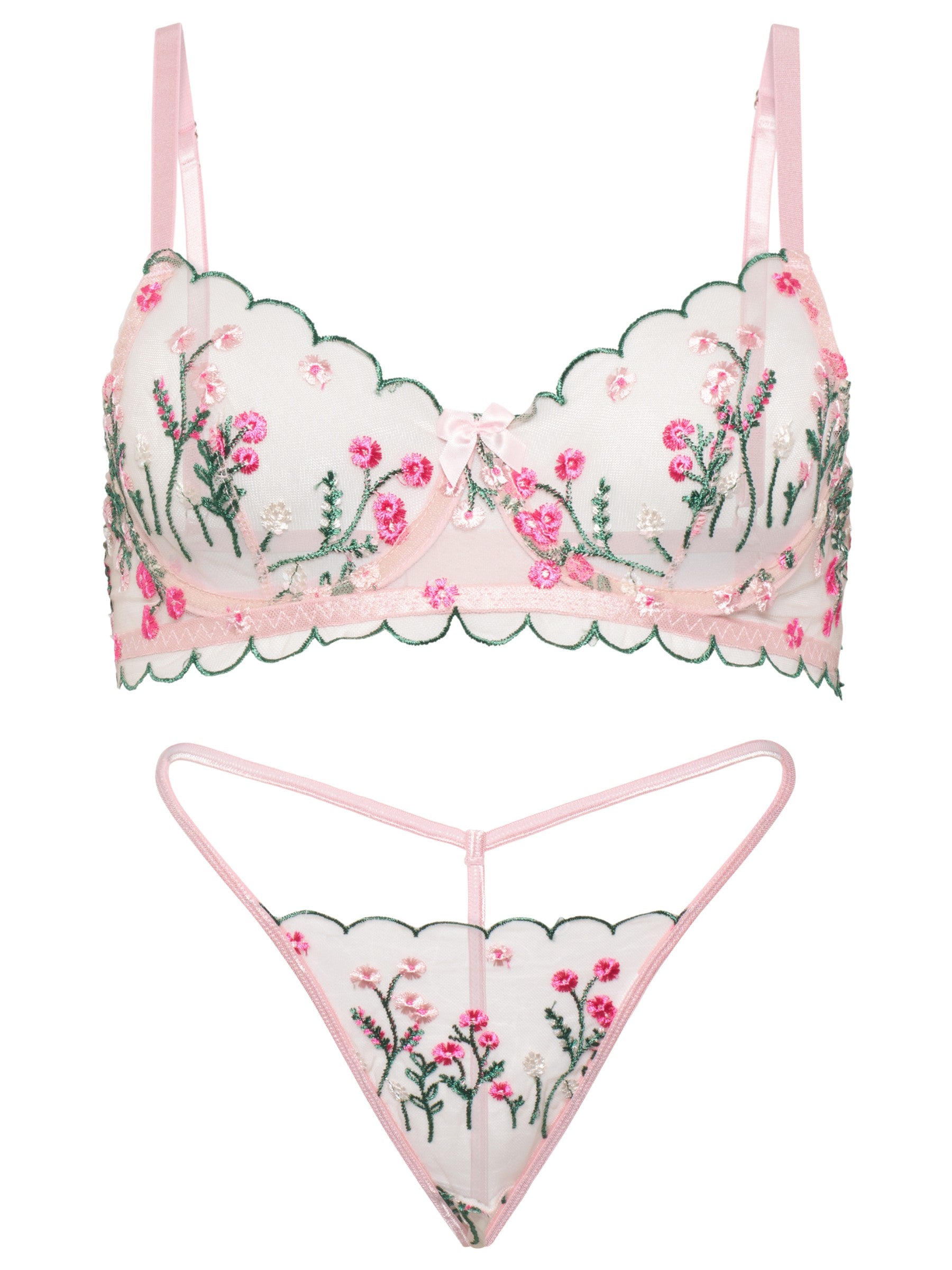 Luxuriöses Dessous-Set mit bügellosem BH und floralem Tanga. Feine Stickerei, weiche Spitze und elastisches Mesh sorgen für stilvollen Tragekomfort. Perfekt für Alltag und besondere Anlässe – feminin, bequem, hochwertig.