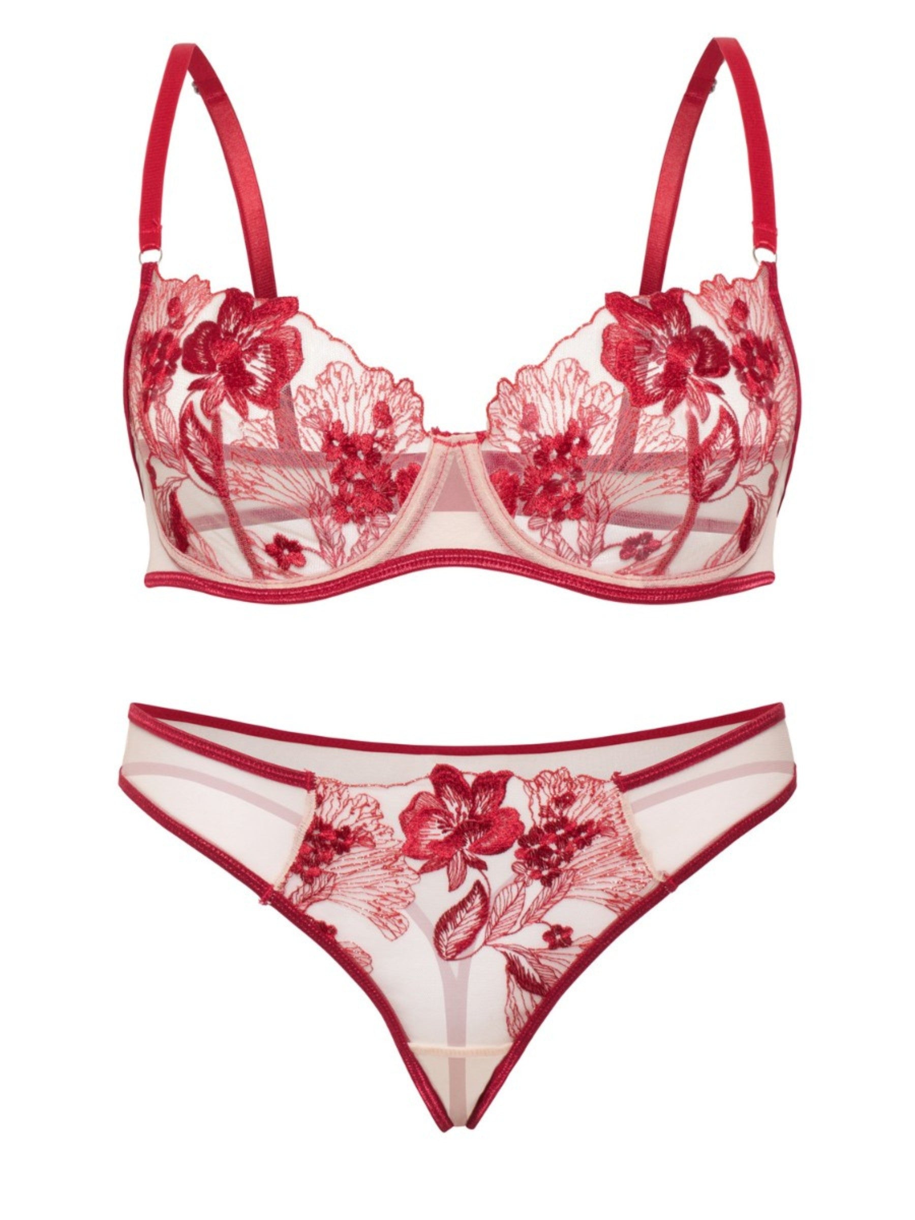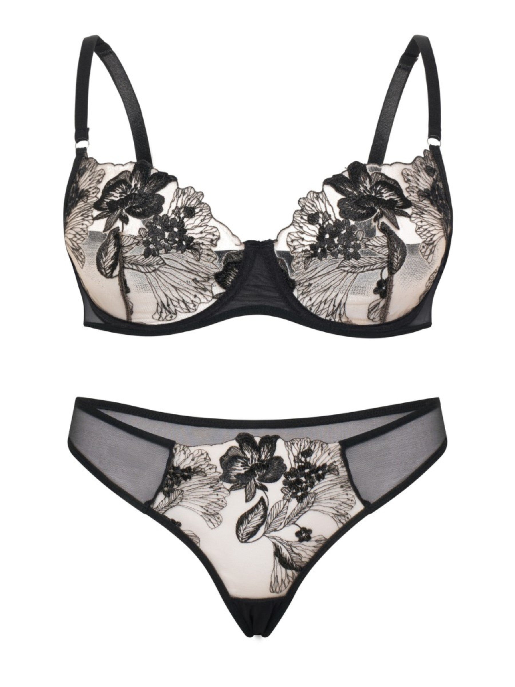 Dieses elegante Dessous-Set besticht durch feine Stickerei und ein stilvolles Design. Der Bügel-BH bietet perfekten Halt, während der passende Tanga für hohen Tragekomfort sorgt.