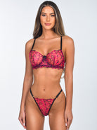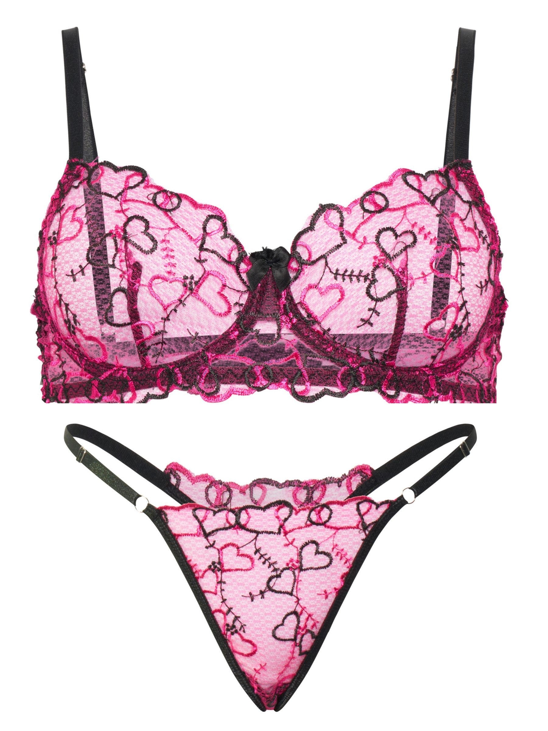 Romantisches Dessous-Set mit Bügel-BH und String, verziert mit feiner Spitze, Herz- und Blumenstickerei. Ideal für besondere Anlässe oder um sich selbst stilvoll zu verwöhnen.