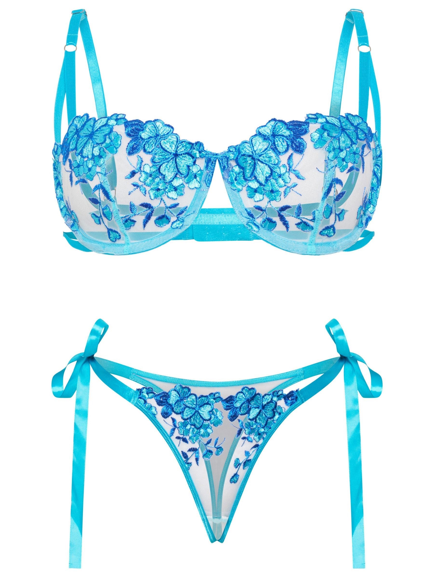 Zartes Mesh-Dessous mit Bügel-BH und passendem Tanga. Durchsichtige Spitze, hochwertige Stickerei und komfortabler Sitz machen dieses 2-teilige Set zum eleganten Begleiter für besondere Momente.
