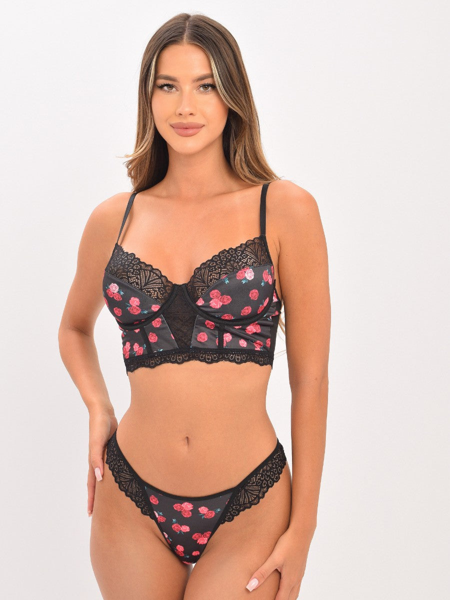 Elegantes Longline-Dessous-Set mit Rosenstickerei: Bügel-BH in schmeichelnder Form und passender Spitzen-String. Hochwertige Materialien, bequemer Sitz und romantische Details für stilvolle Momente.