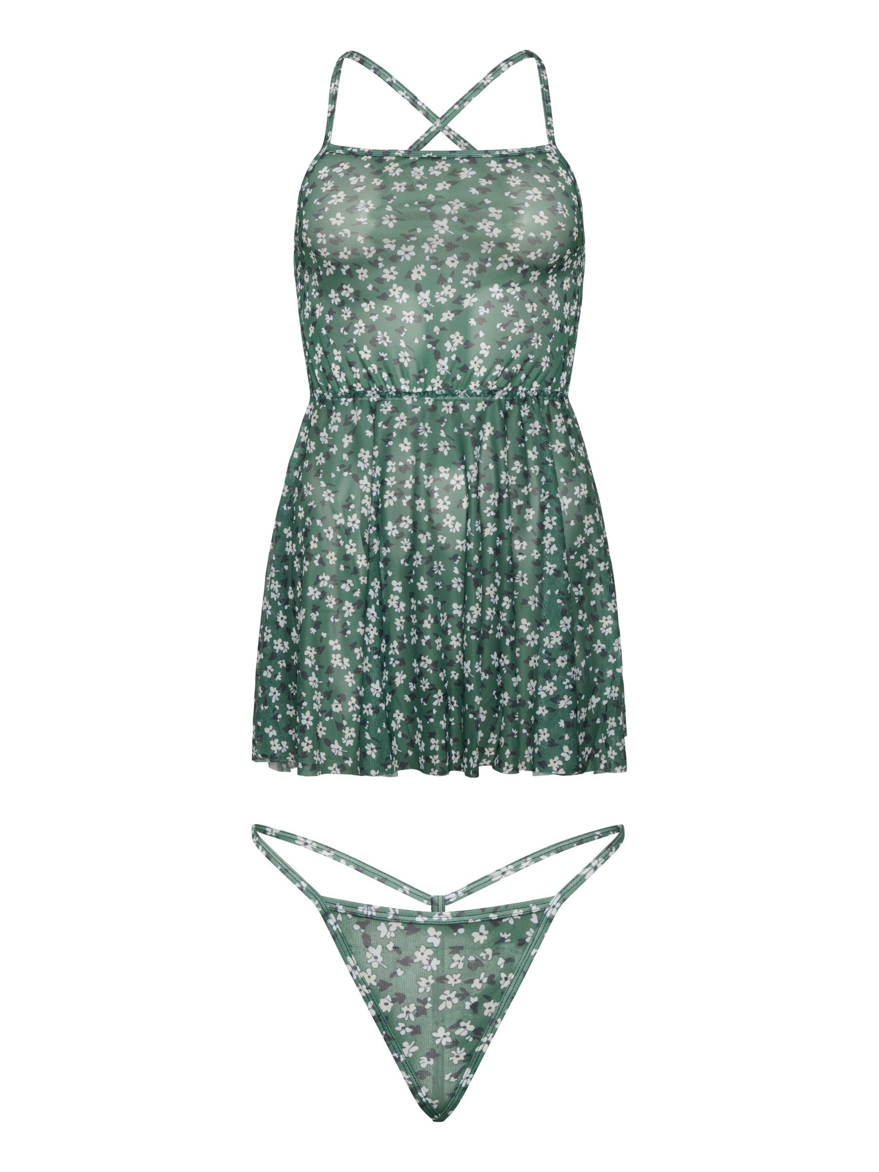 Zartes Negligé-Set aus transparentem Chiffon mit floralem Muster, rückenfreiem Design und passendem G-String. Bequem, feminin und ideal für besondere Momente oder stilvolle Homewear.