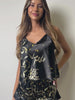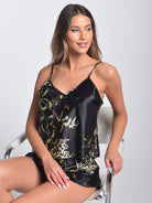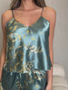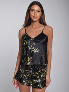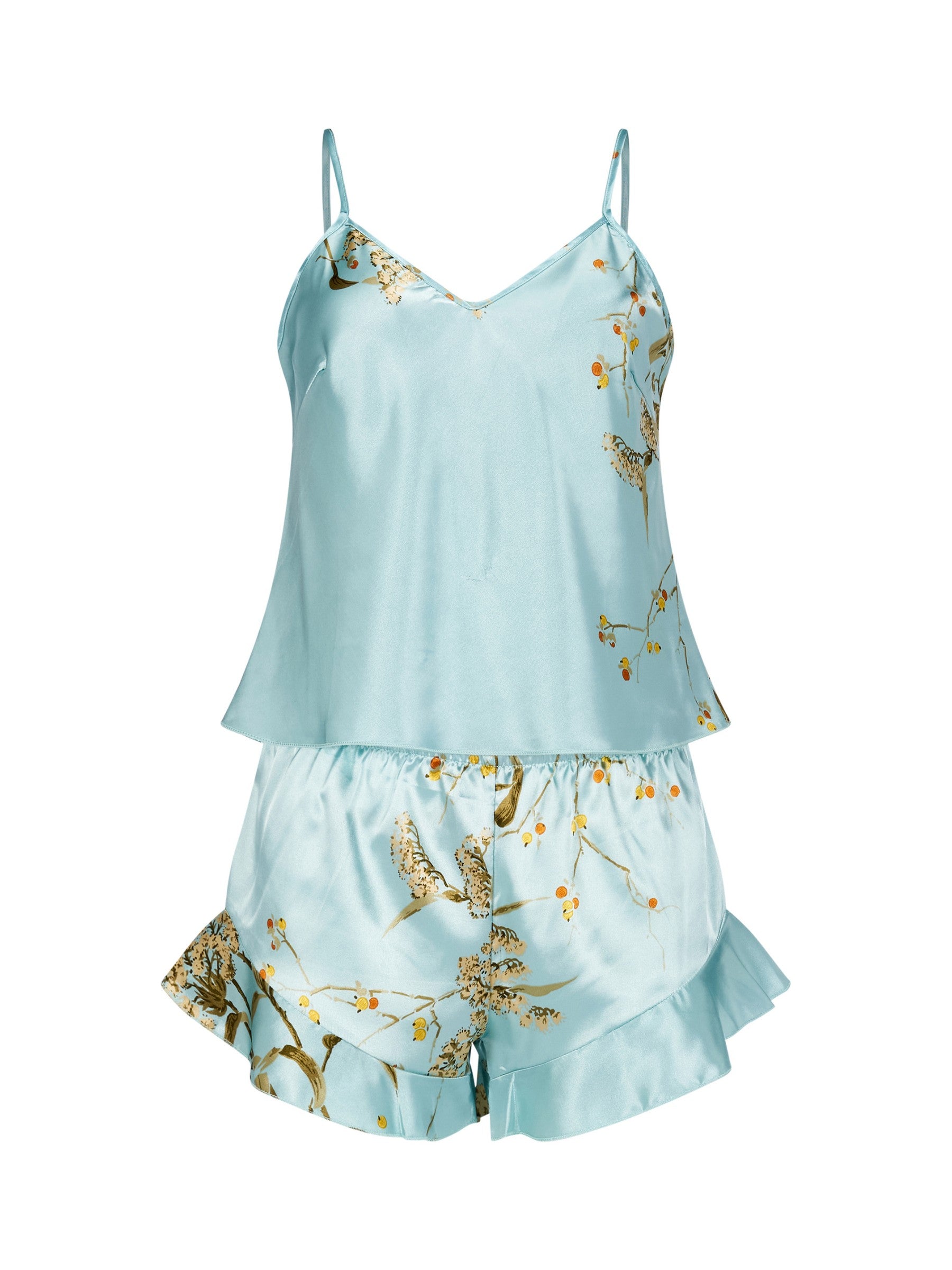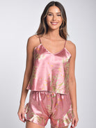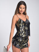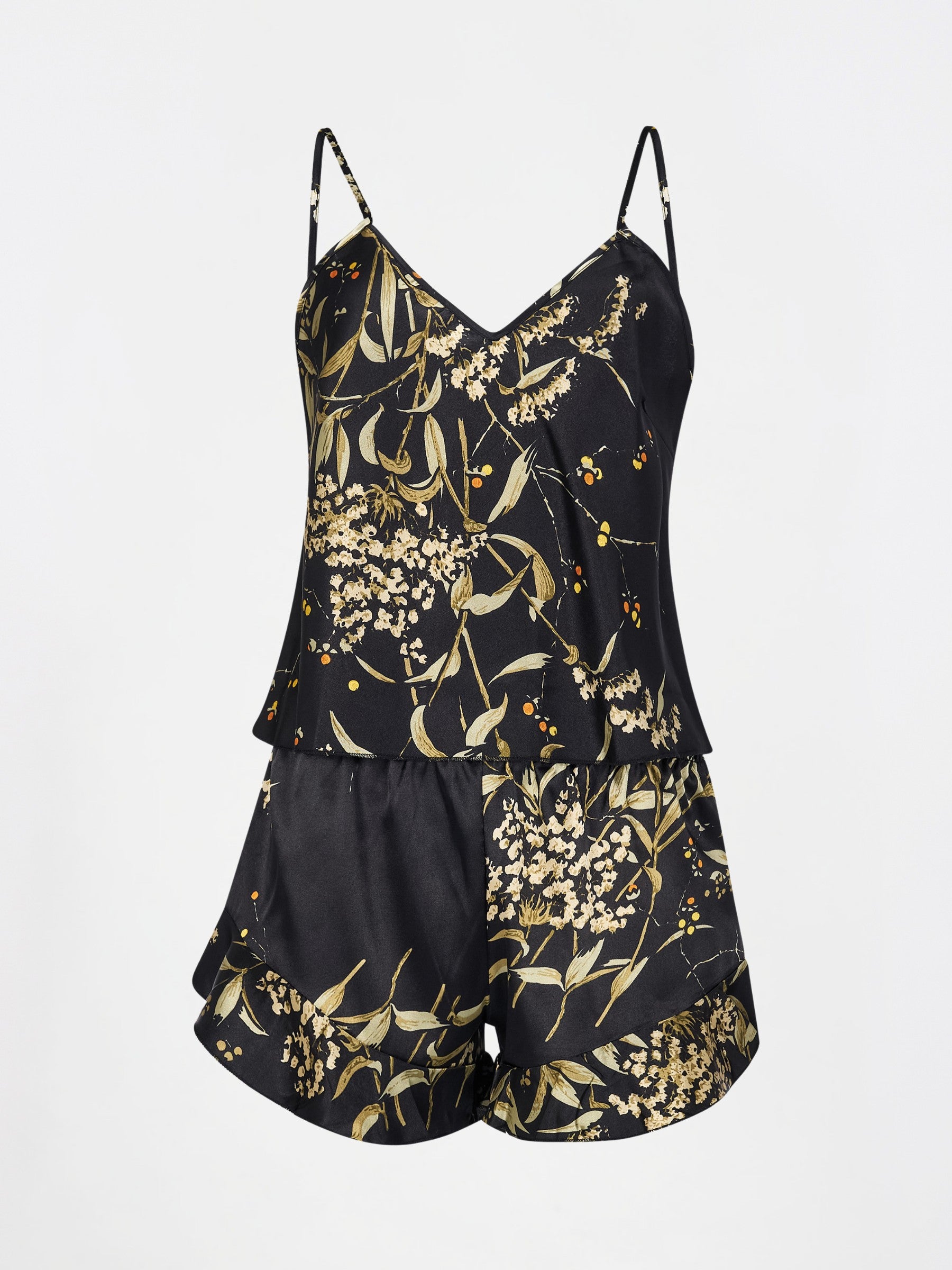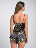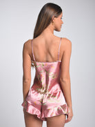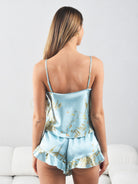 Erleben Sie Stil und Komfort mit unserem Satin-Pyjama-Set. Das 2-teilige Set aus Crop-Cami-Top und Shorts mit Rüschensaum besticht durch romantischen Blumendruck und zarte Details. Perfekt für entspannte Nächte oder stilvolle Loungewear.