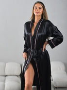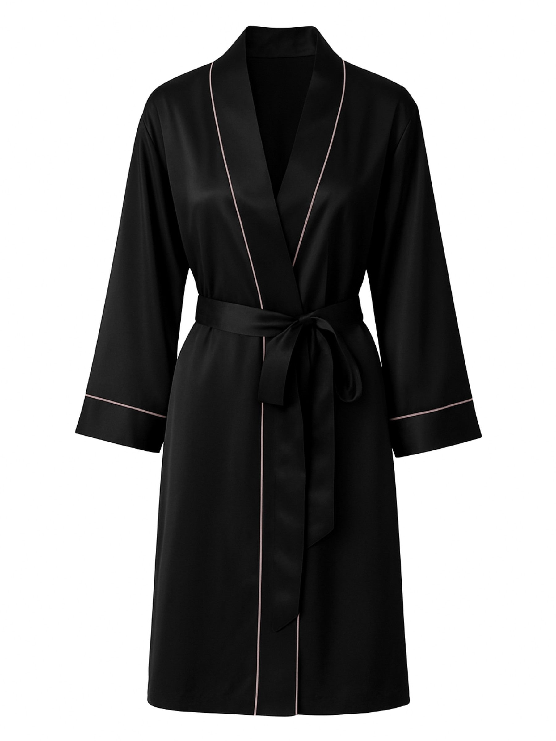 Ein edler Morgenmantel aus glänzendem Satin – mit tiefem V-Ausschnitt, Taillengürtel und langen Ärmeln. Für Frauen, die Komfort lieben und stilvoll entspannen wollen – ideal für Nacht und Morgenroutine.