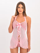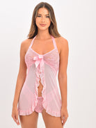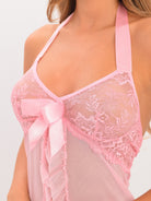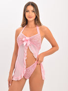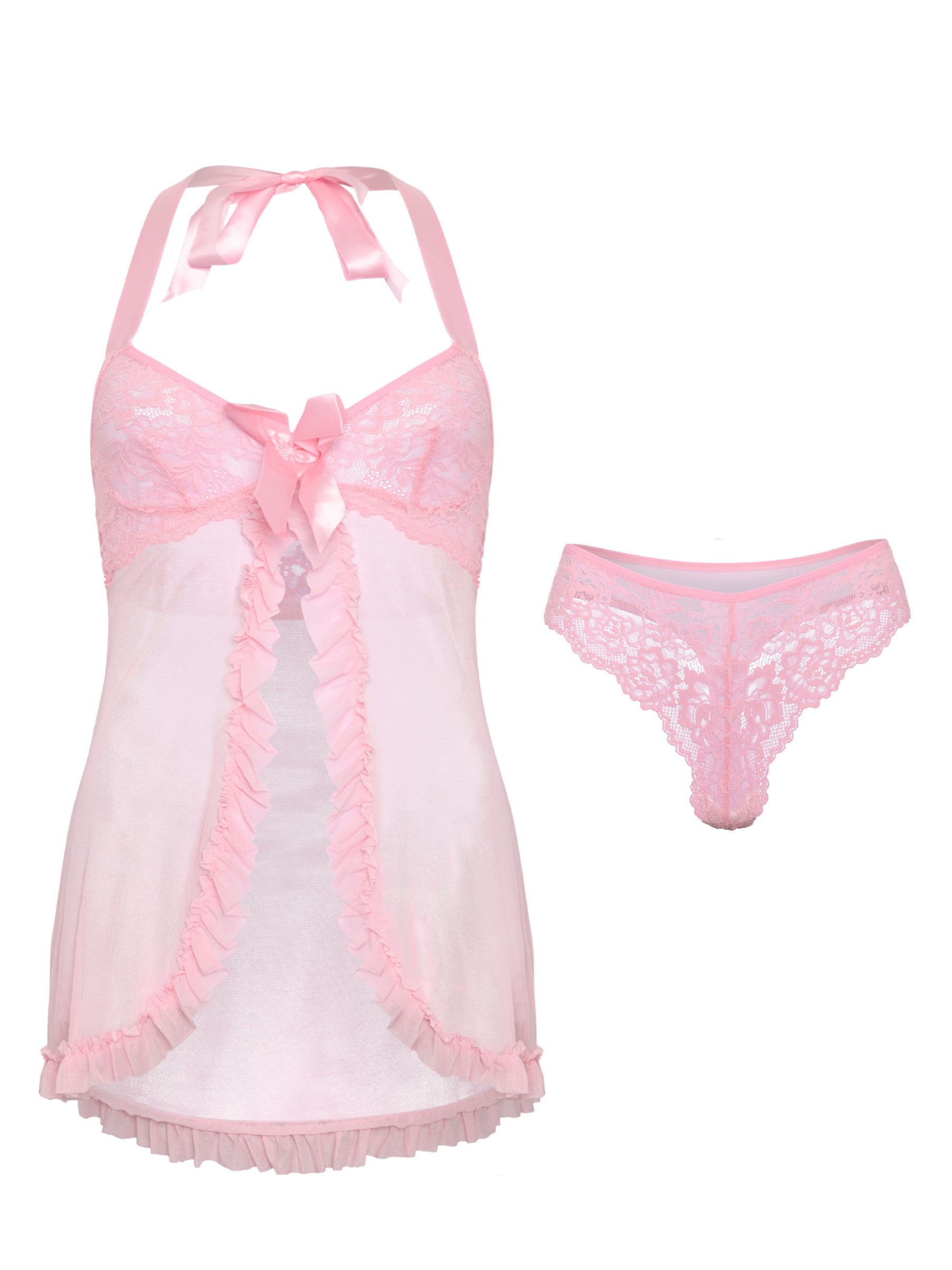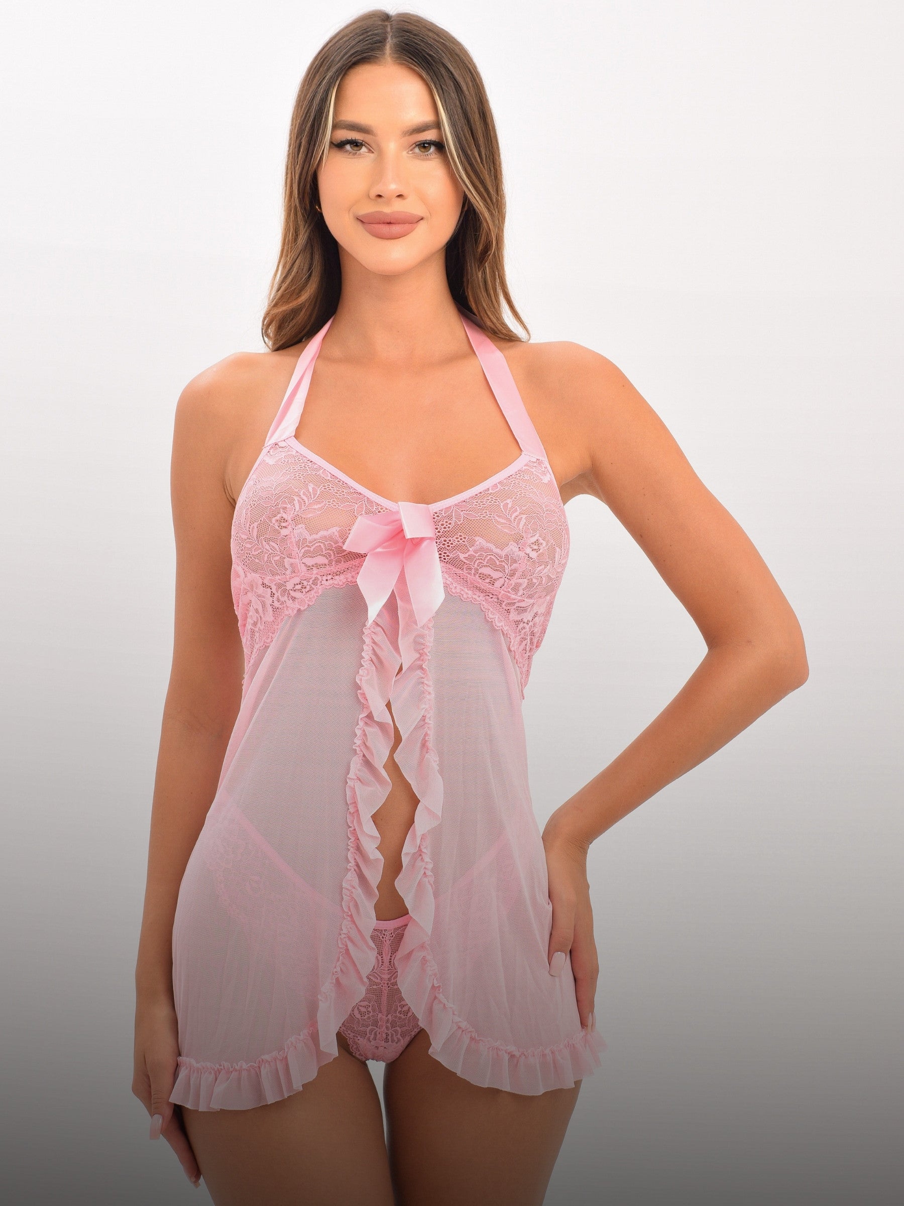Zweiteiliges Babydoll-Set aus zartem Mesh mit floraler Spitze, Neckholder-Design und passendem Spitzenslip – stilvoll, leicht und komfortabel für besondere Momente.