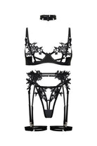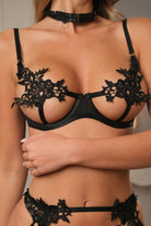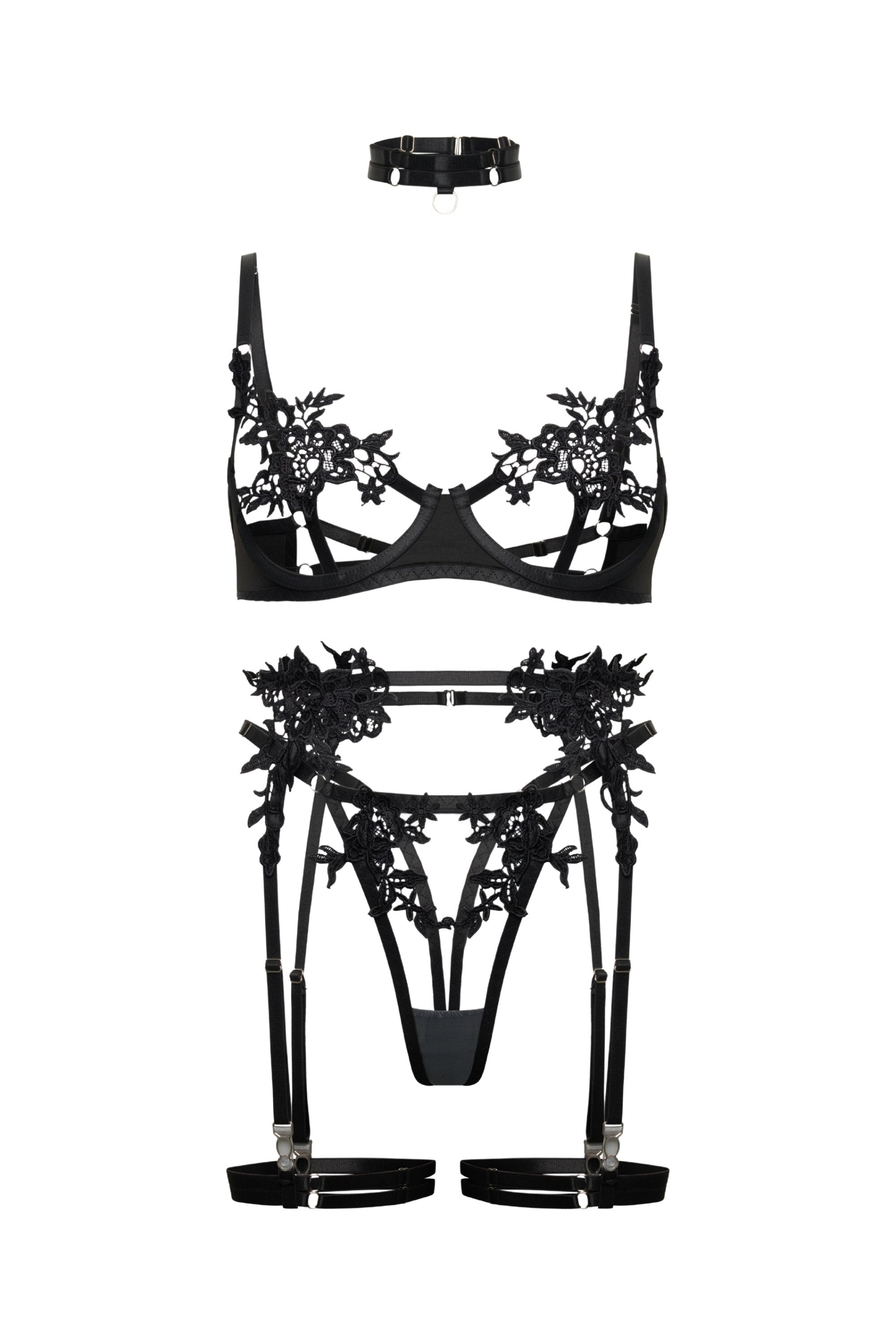 Edles 6-teiliges Set in Schwarz: Cut-out-BH mit floraler Spitze, String mit Mesh-Einsatz, Choker sowie Strapsgurte mit zwei Beinbändern.
