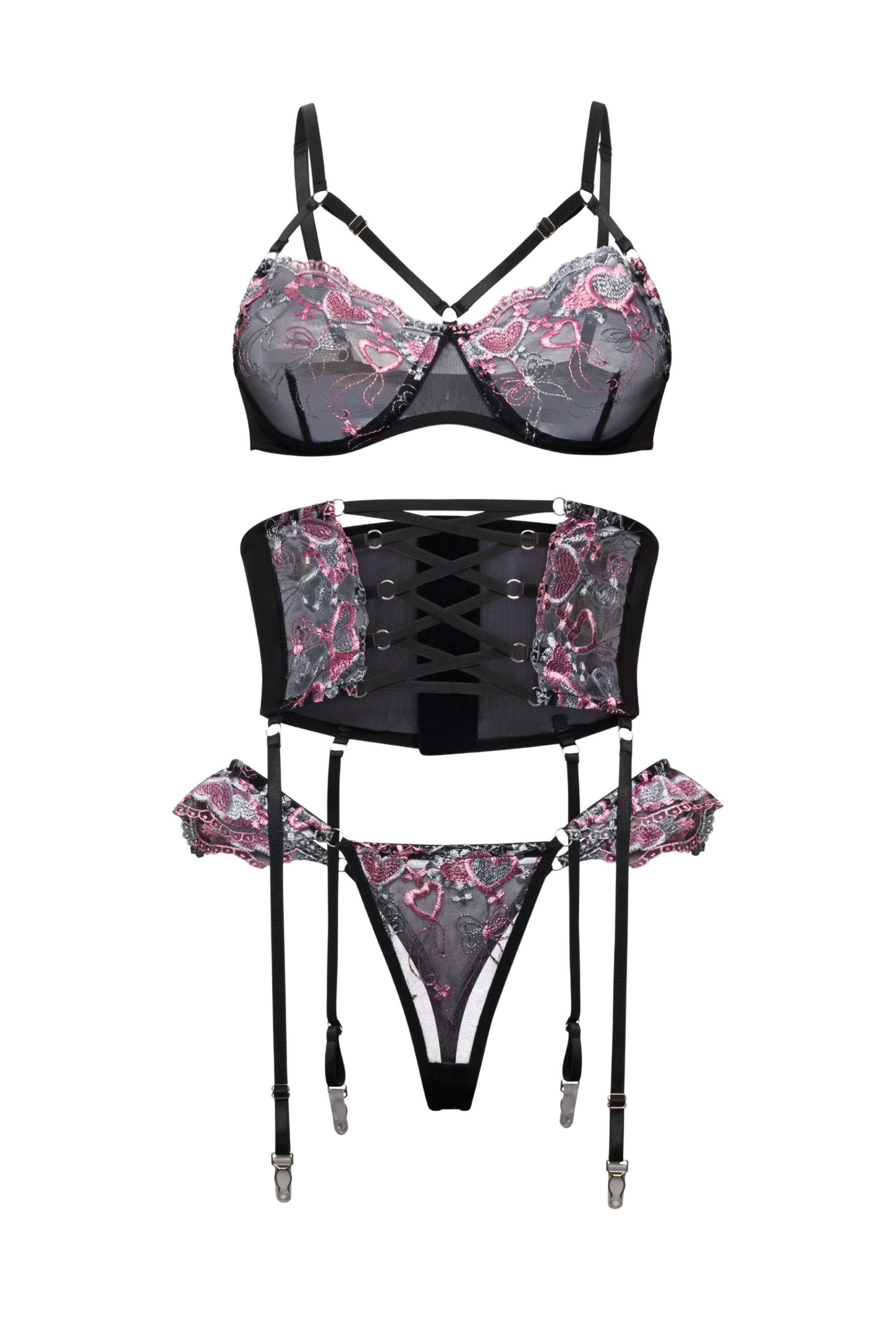 Schwarzes Mesh trifft auf verspielte Herzstickerei in zarten Rosé- und Weißtönen. Der hoch geschnittene Strapsgürtel mit markanter Schnür-Front setzt die Silhouette stilvoll in Szene. Feine Zierbänder und Metall-Details runden den Look luxuriös ab.