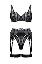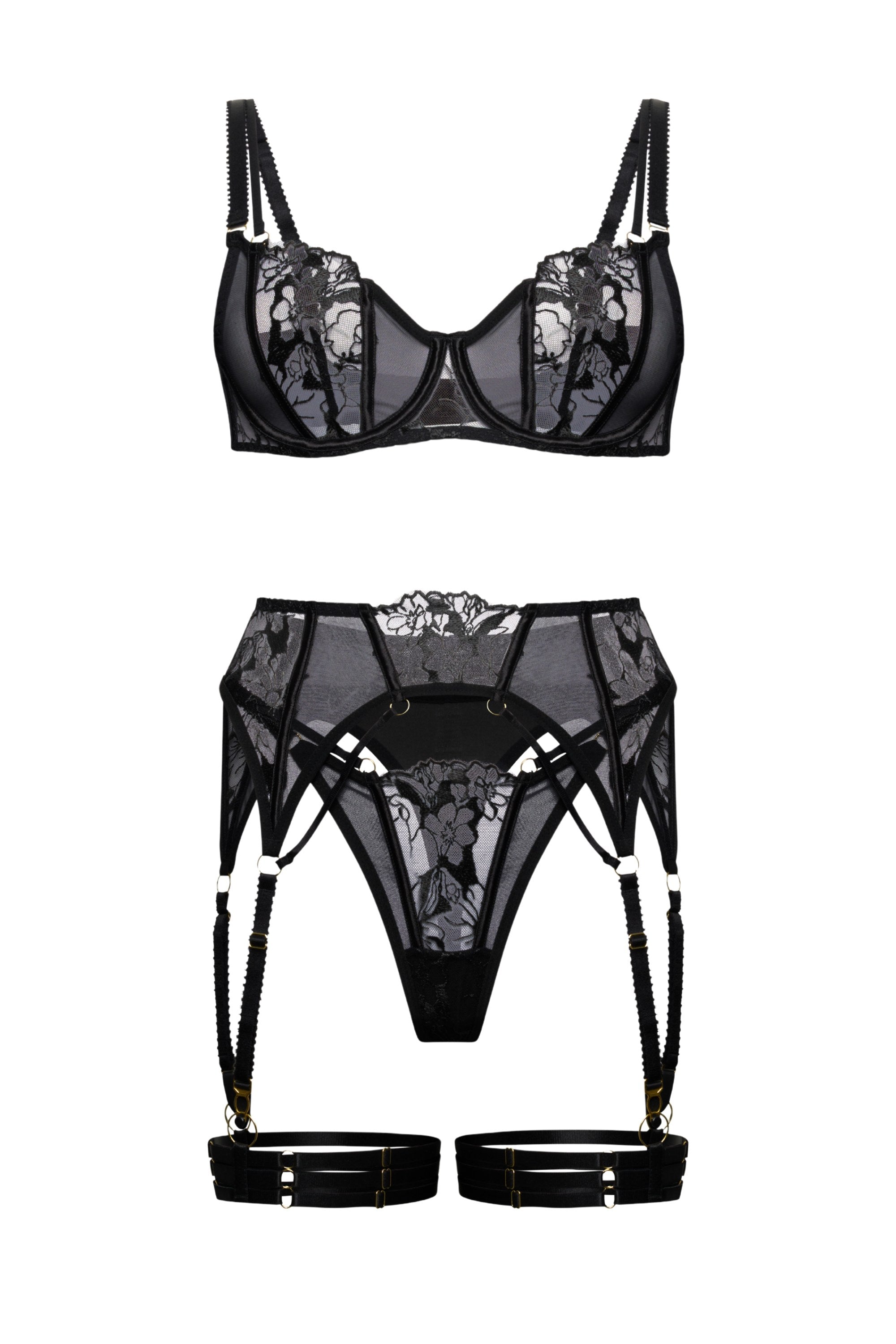 Schwarzes 5-teiliges Set mit Spitzen-BH sowie High-Waist-Look mit Taillendetail und Zierbändern, ergänzt durch zwei Beinbänder – modern, detailreich und figurbetont.