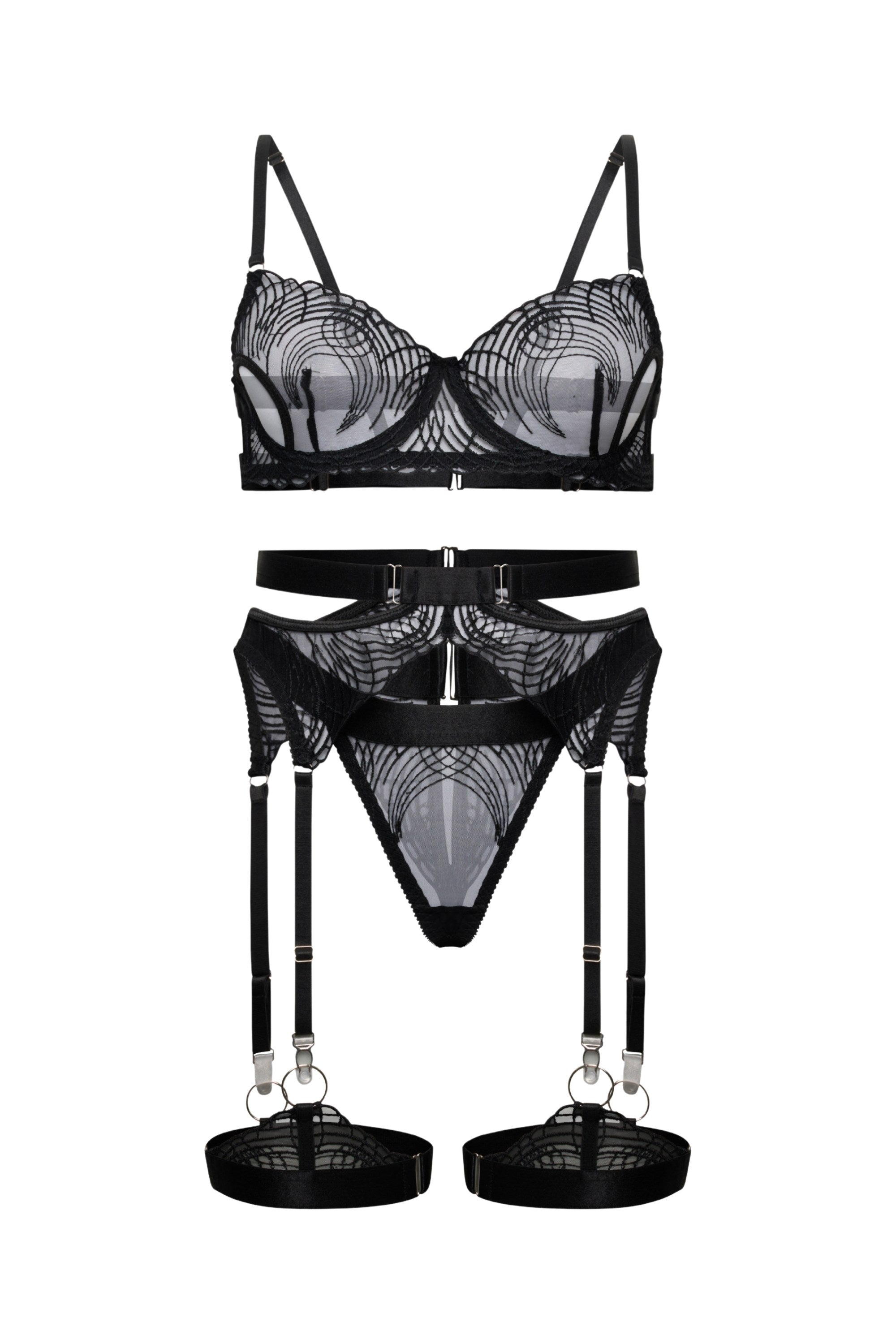 Schwarzes 5-teiliges Set aus Spitze und Mesh mit grafischer Stickerei, Cut-outs, Taillenband sowie Beinbändern – modern, feminin und angenehm leicht zu tragen