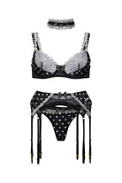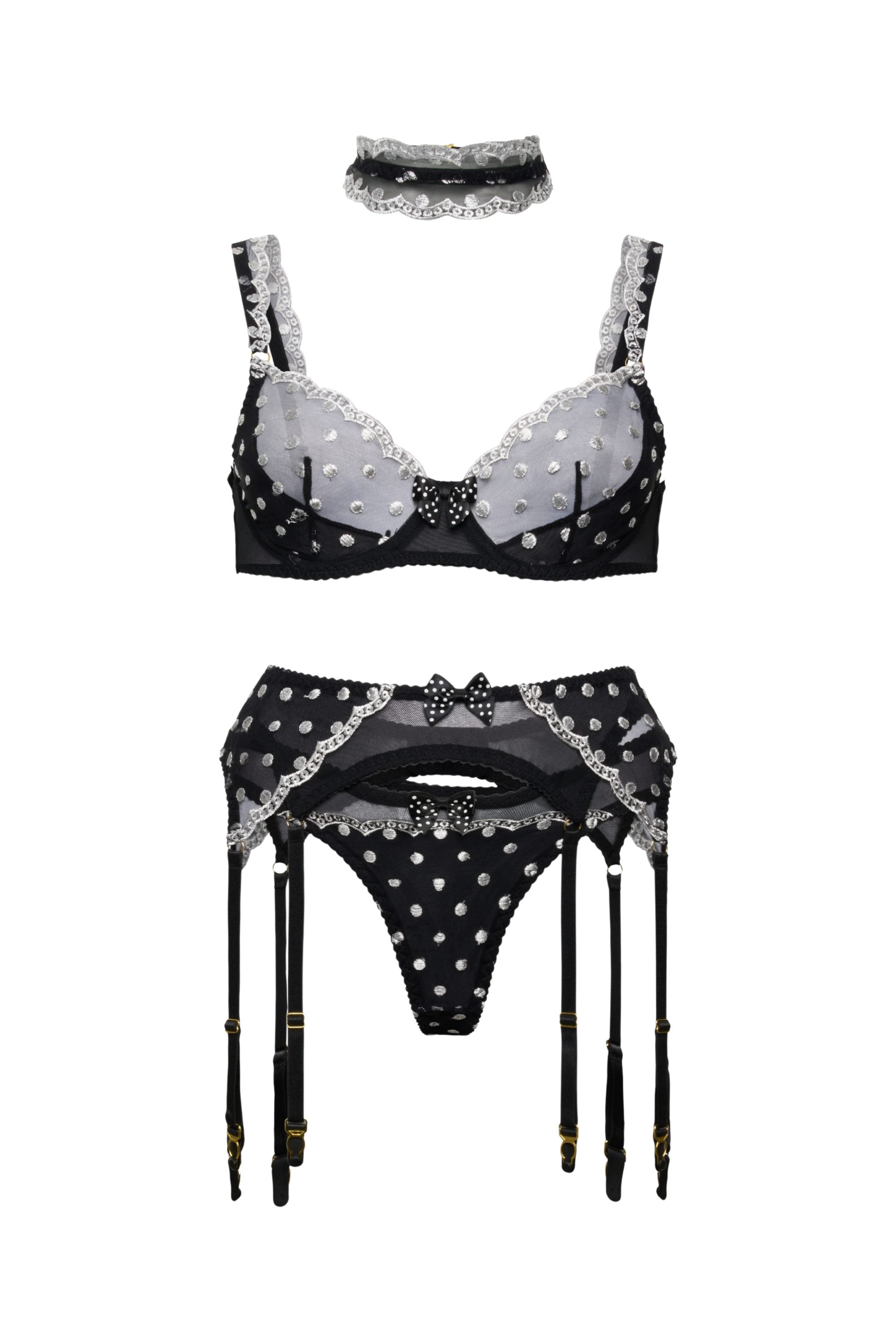 3-teiliges Dessous-Set aus schwarzem Punktemesh mit Spitzenbordüre und Schleifendetails: BH, Strapsgürtel mit vier Strapsgurten und passender Slip