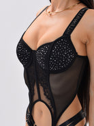 Elegantes 3-teiliges Corsagen-Set mit glitzerndem Strass, figurformendem Body, zarten Netzstrümpfen und passendem Tanga – ideal für stilvolle Auftritte bei besonderen Anlässen.