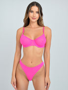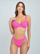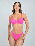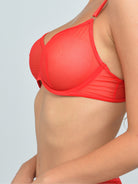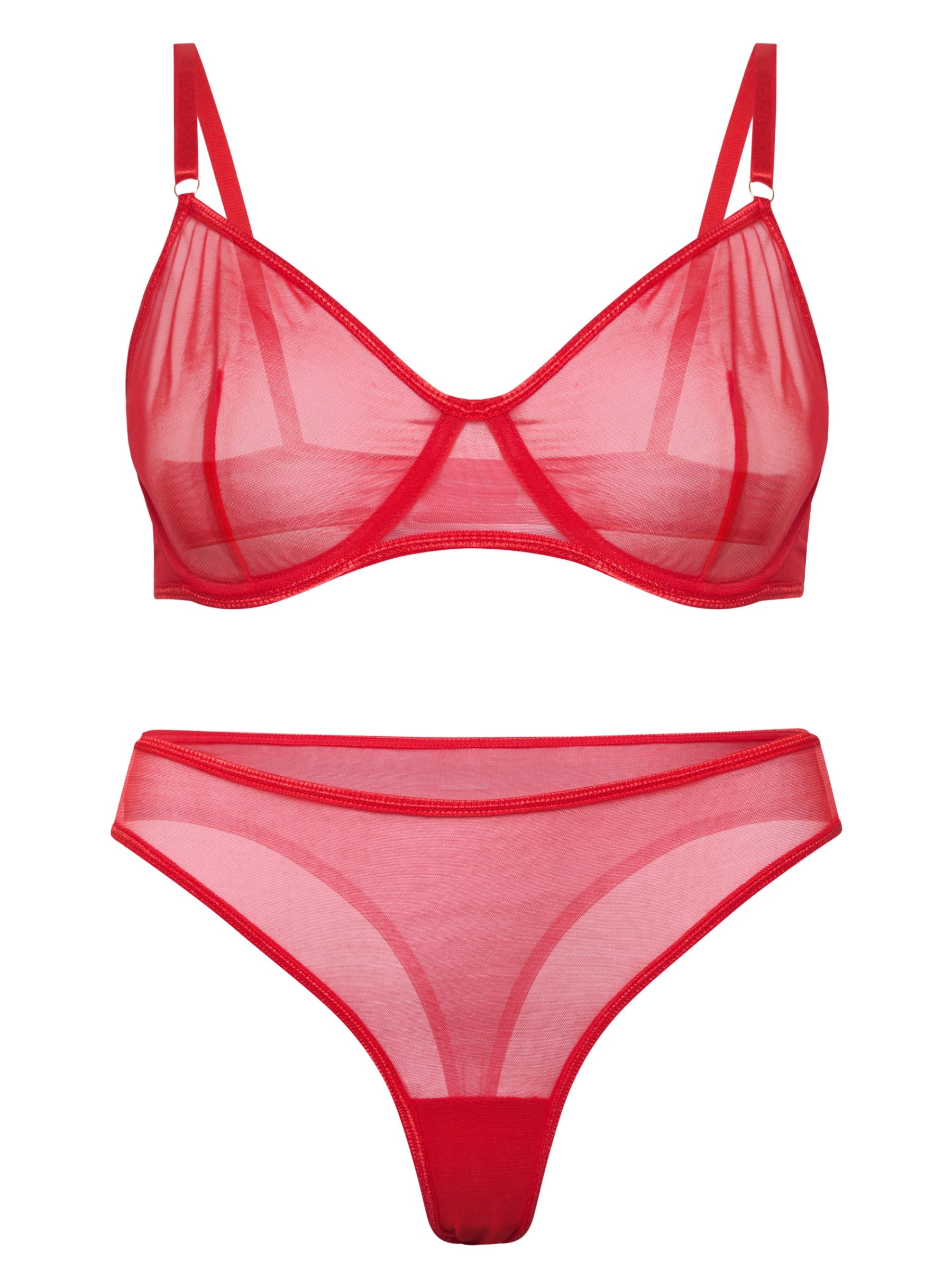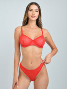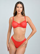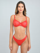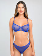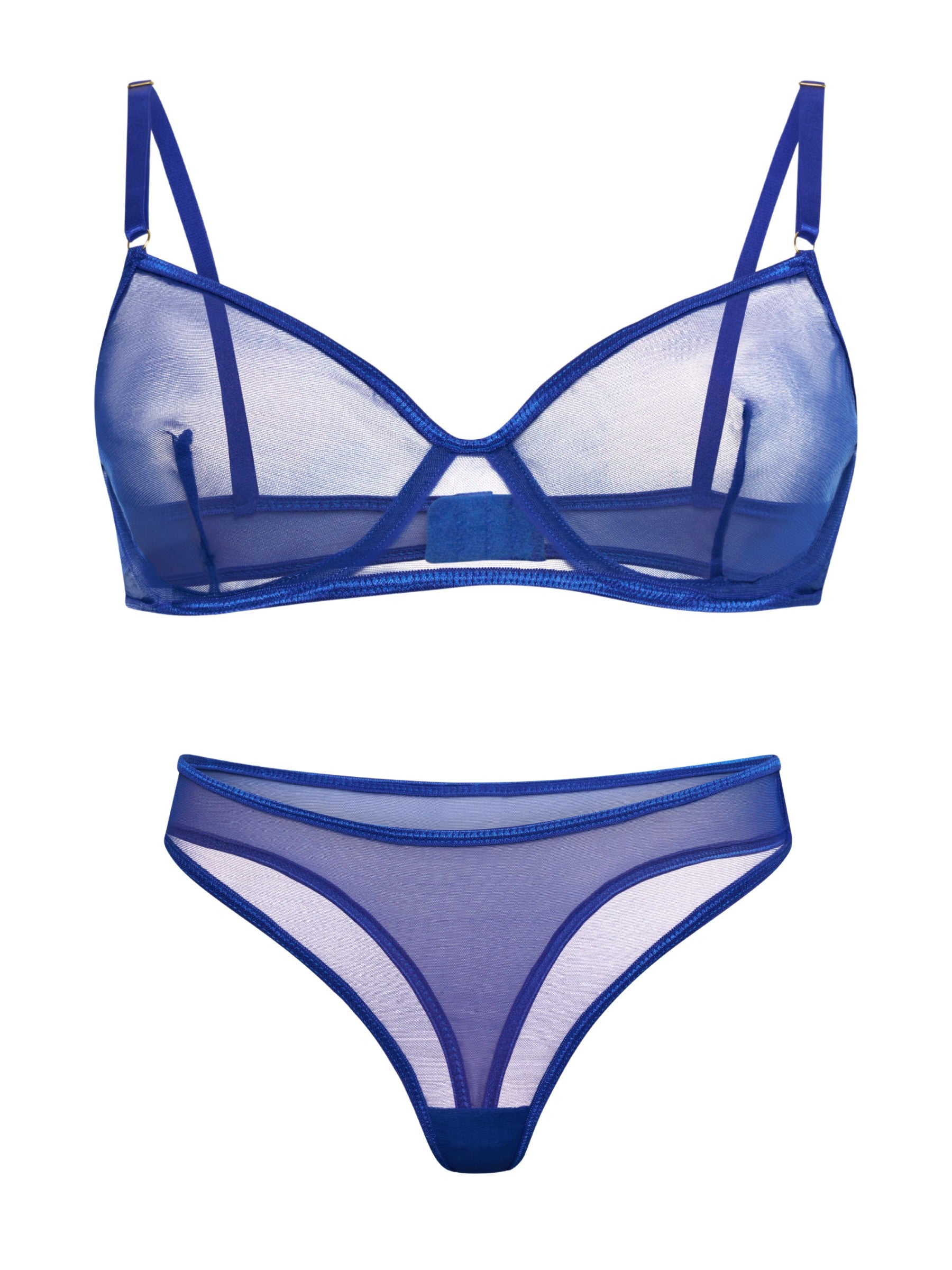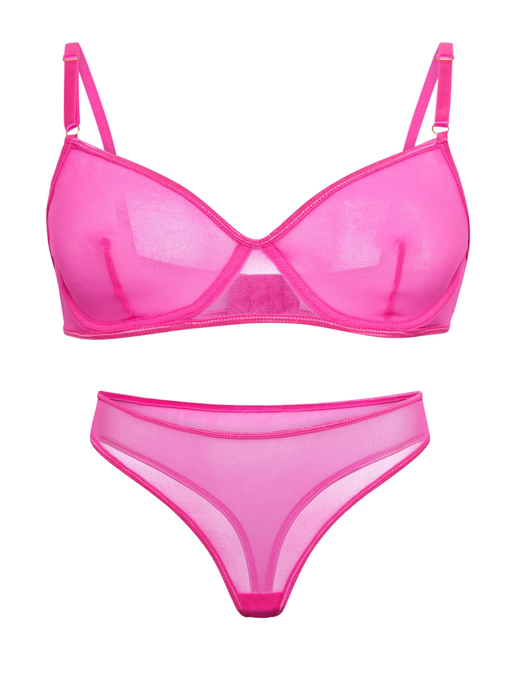 Modernes Dessous-Set mit Bügel-BH und passendem Tanga. Transparenter Mesh sorgt für ein luftiges Tragegefühl, während feine Details und eine präzise Passform feminine Eleganz betonen.