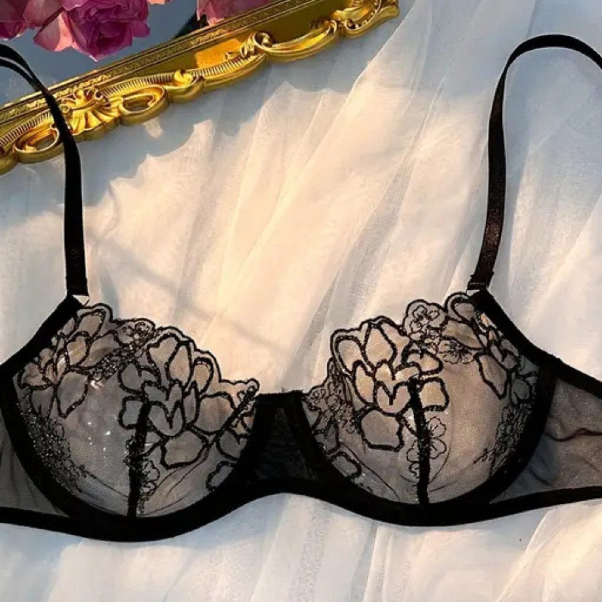 - Sensual Design : push-up bra with fine embroidery & matching tulle thong