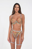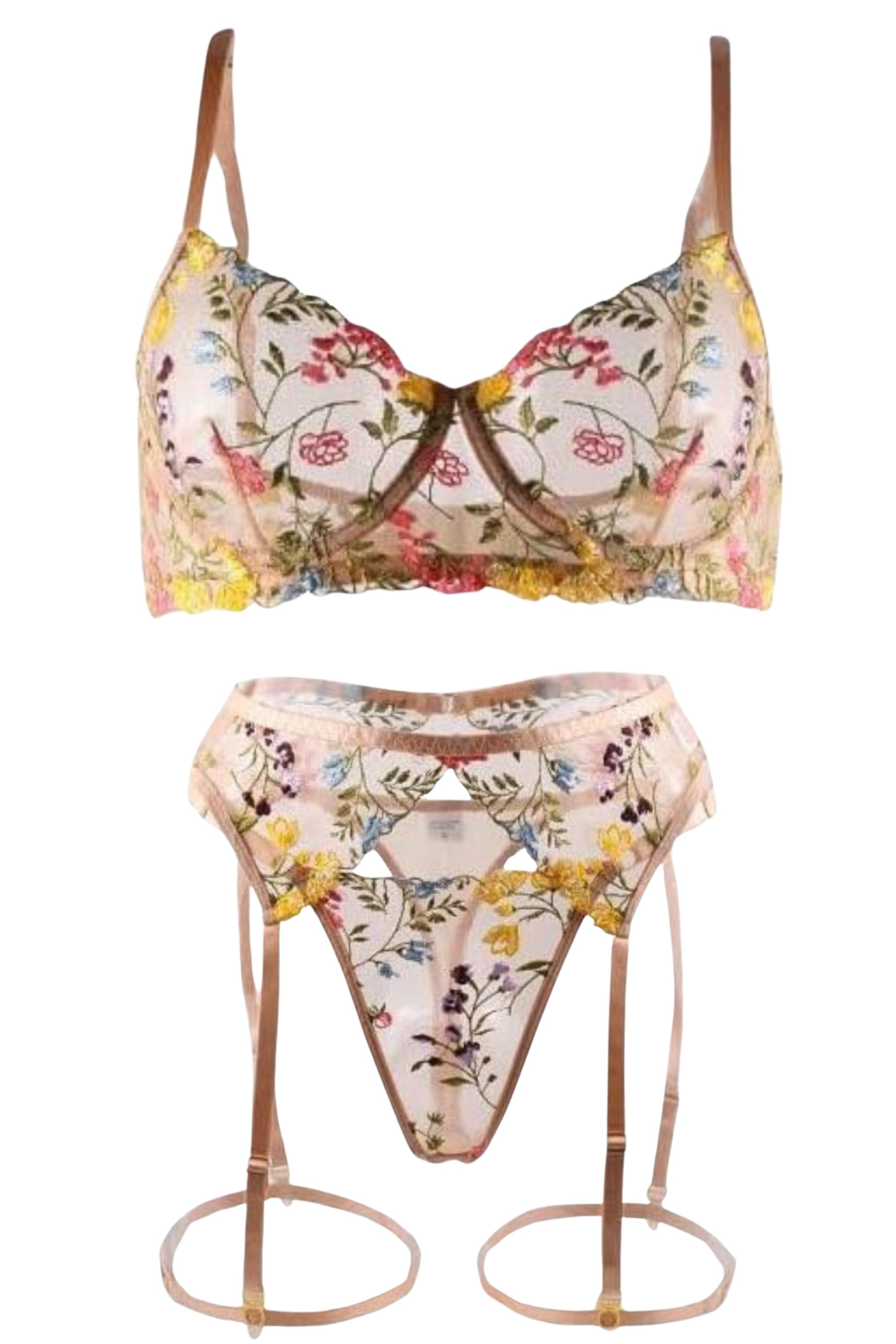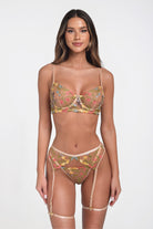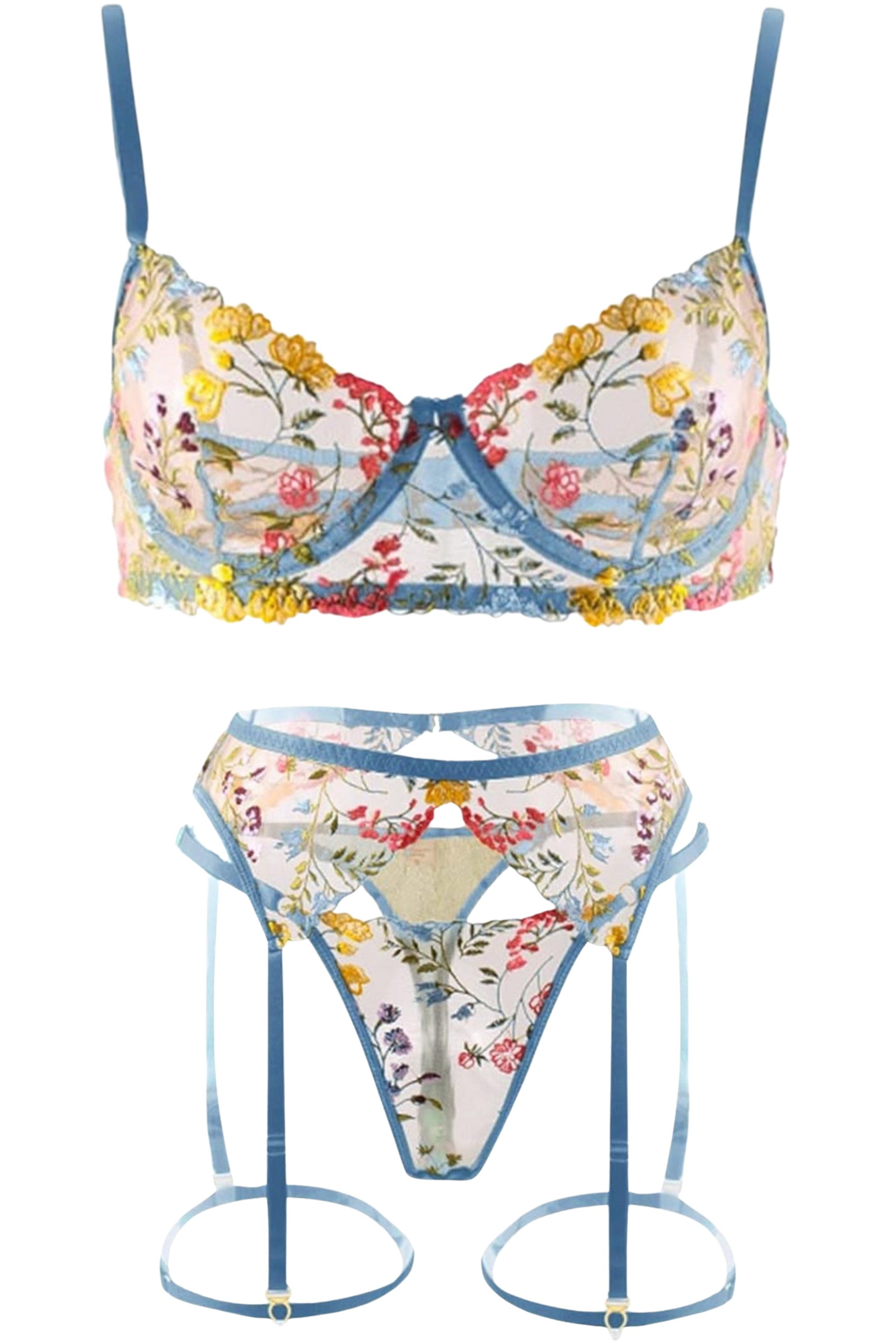Discover timeless elegance with our embroidered lingerie set. Featuring an unlined bra and garter belt thong made of delicate mesh with artistic embroidery, this set is perfect for stylish moments. High-quality craftsmanship offers unparalleled comfort and elegance.