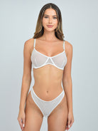 A light lingerie set with an underwire bra for gentle support and a matching thong. Transparent lace and delicate details create an elegant silhouette – perfect for style-conscious moments with a touch of sophistication.
