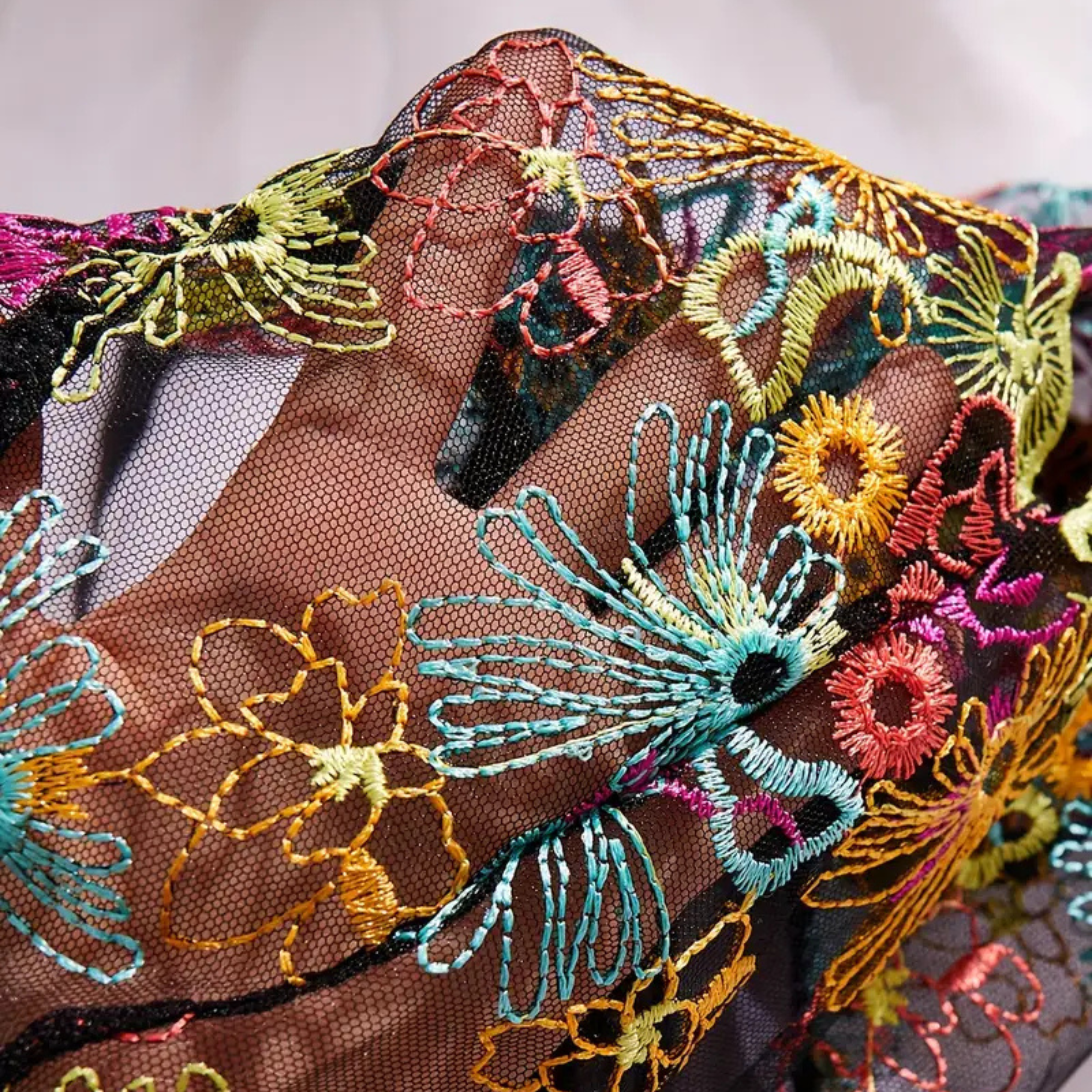 Design délicat : Broderie fine sur maille translucide pour un look féminin.