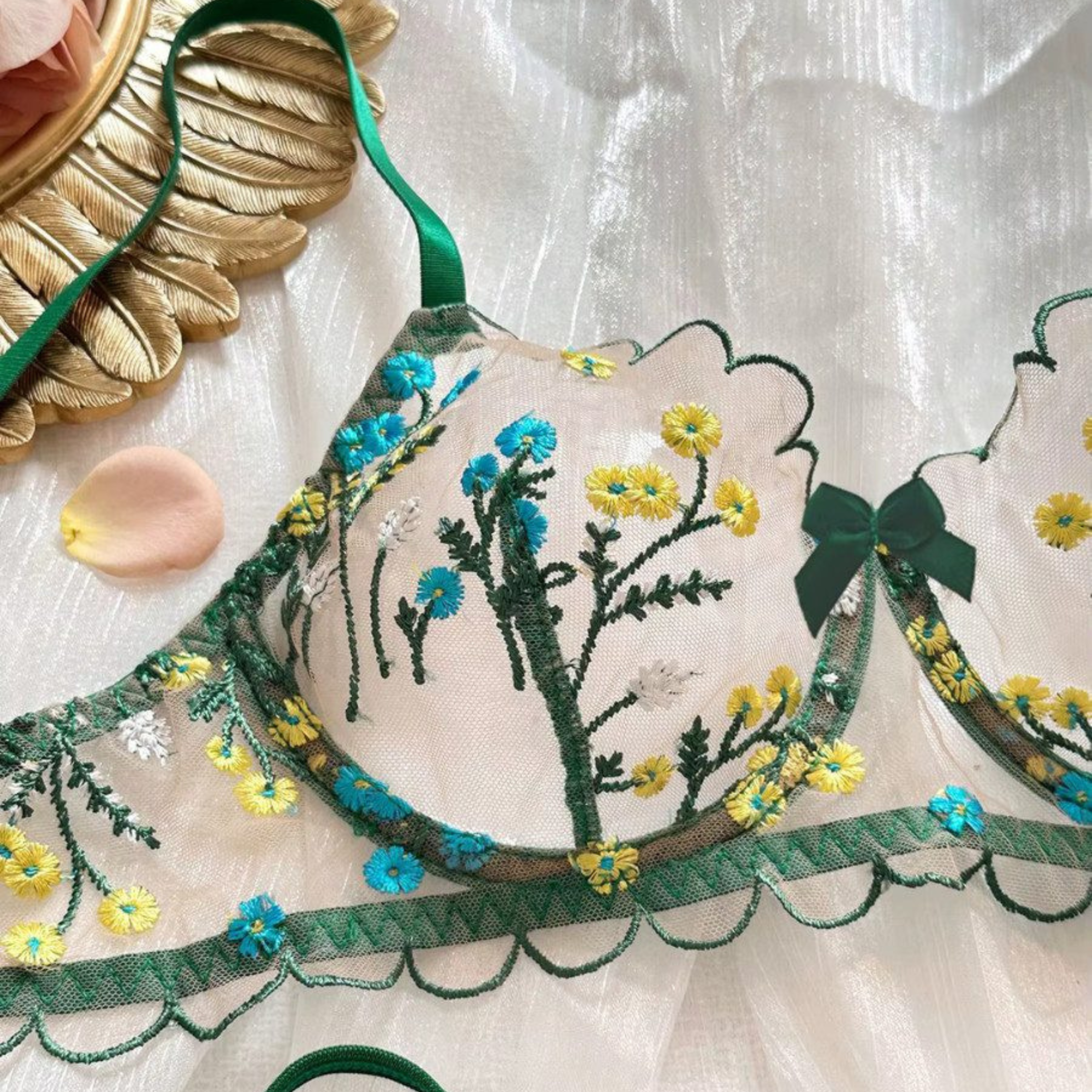 Ensemble de lingerie luxueux composé d'un soutien-gorge sans armatures et d'un string fleuri. Broderies raffinées, dentelle douce et maille extensible pour un confort élégant. Parfait au quotidien comme pour les grandes occasions : féminin, confortable et de haute qualité.