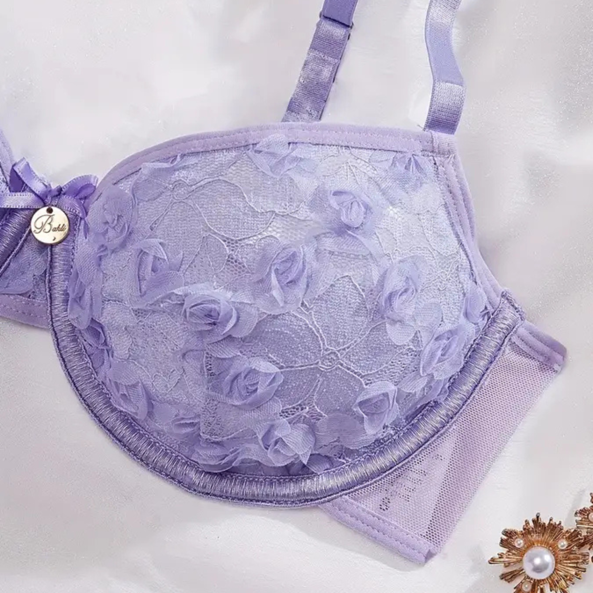 Ensemble de lingerie élégant composé d'un soutien-gorge à armatures et d'un string délicat en dentelle florale. Les détails floraux finement travaillés créent un look élégant alliant confort et esthétique, idéal pour des moments privilégiés avec soi-même.