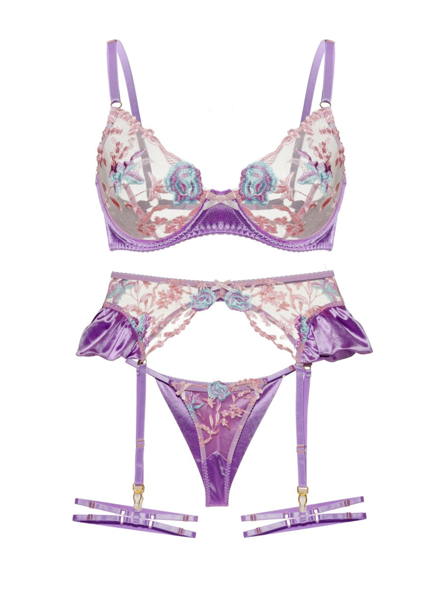 Élégance sensuelle et luxe séduisant ! Cet ensemble de lingerie 3 pièces avec soutien-gorge à armatures brodé, bretelles réglables, string et jarretelles élastiques avec anneau de jambe évoque des looks excitants. Une maille douce pour la peau, une broderie élégante et une coupe parfaite – idéal pour les moments spéciaux !