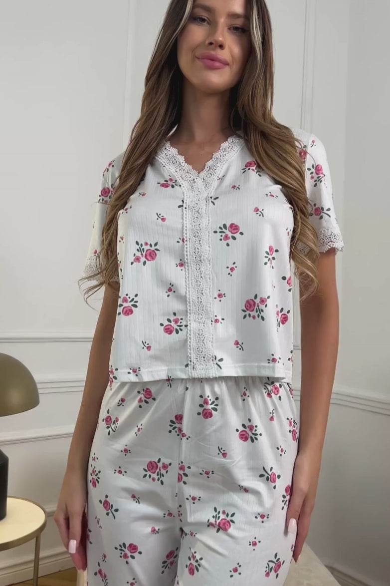 Zweiteiliges Damen-Pyjama-Set mit Blumenprint aus weichem, atmungsaktivem Stoff. Ideal als Nachtwäsche oder Loungewear – stilvoll, bequem und perfekt für entspannte Stunden zu Hause.