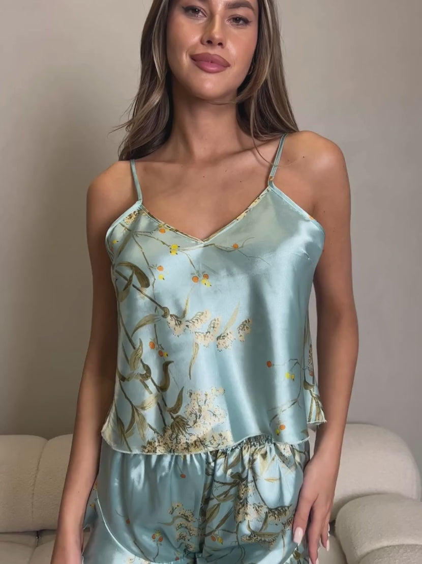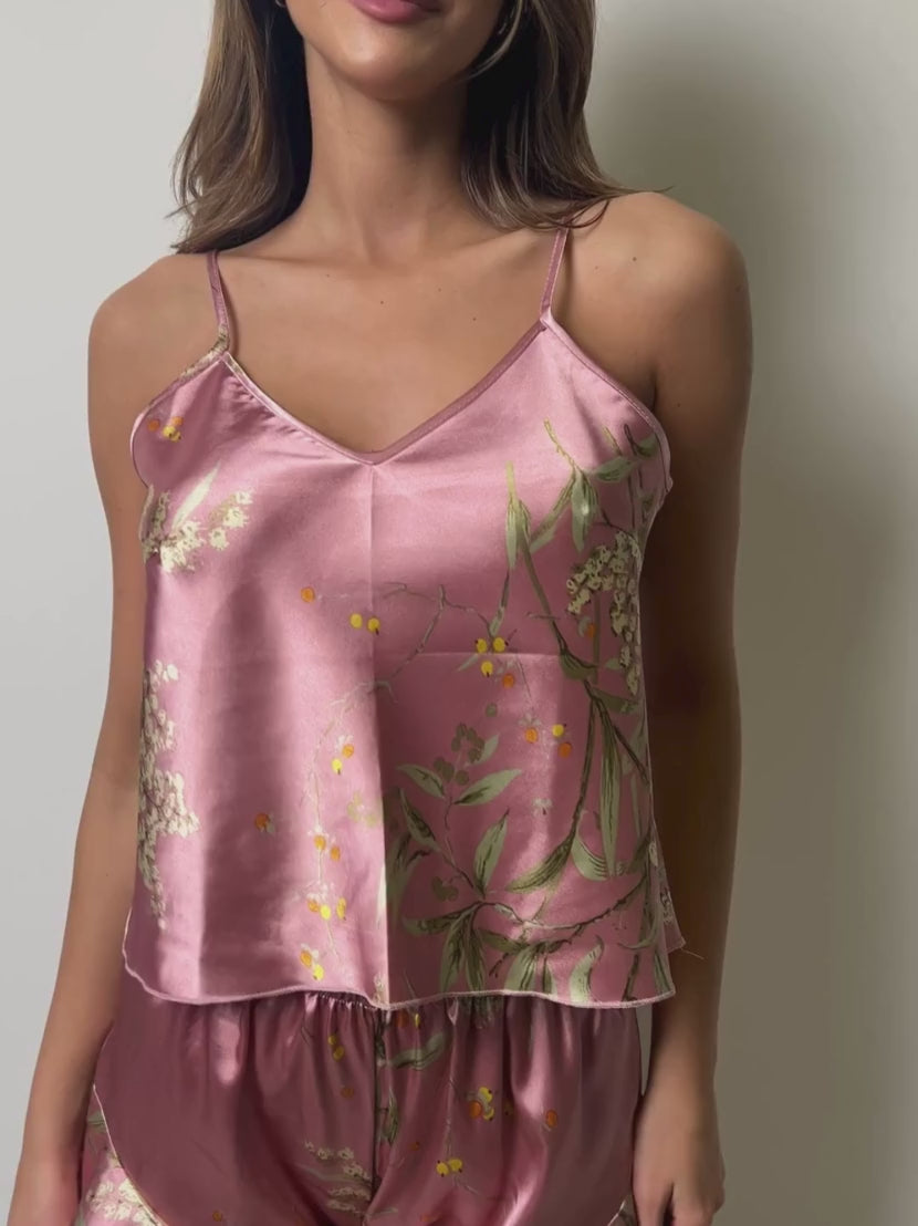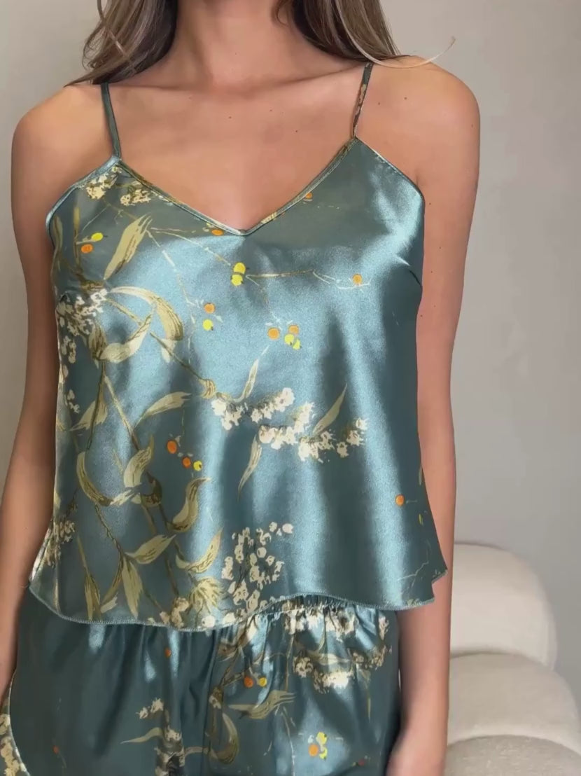 Découvrez style et confort avec notre ensemble pyjama en satin. Cet ensemble deux pièces, composé d'un caraco court et d'un short à volants, arbore un imprimé floral romantique et des détails délicats. Idéal pour des soirées décontractées ou pour une tenue de détente élégante.