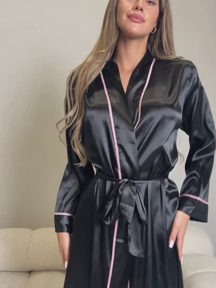 Une robe de chambre sophistiquée en satin brillant, avec un décolleté en V profond, une taille ceinturée et des manches longues. Pour les femmes qui apprécient le confort et souhaitent se détendre avec style, elle est idéale pour le soir et le matin.