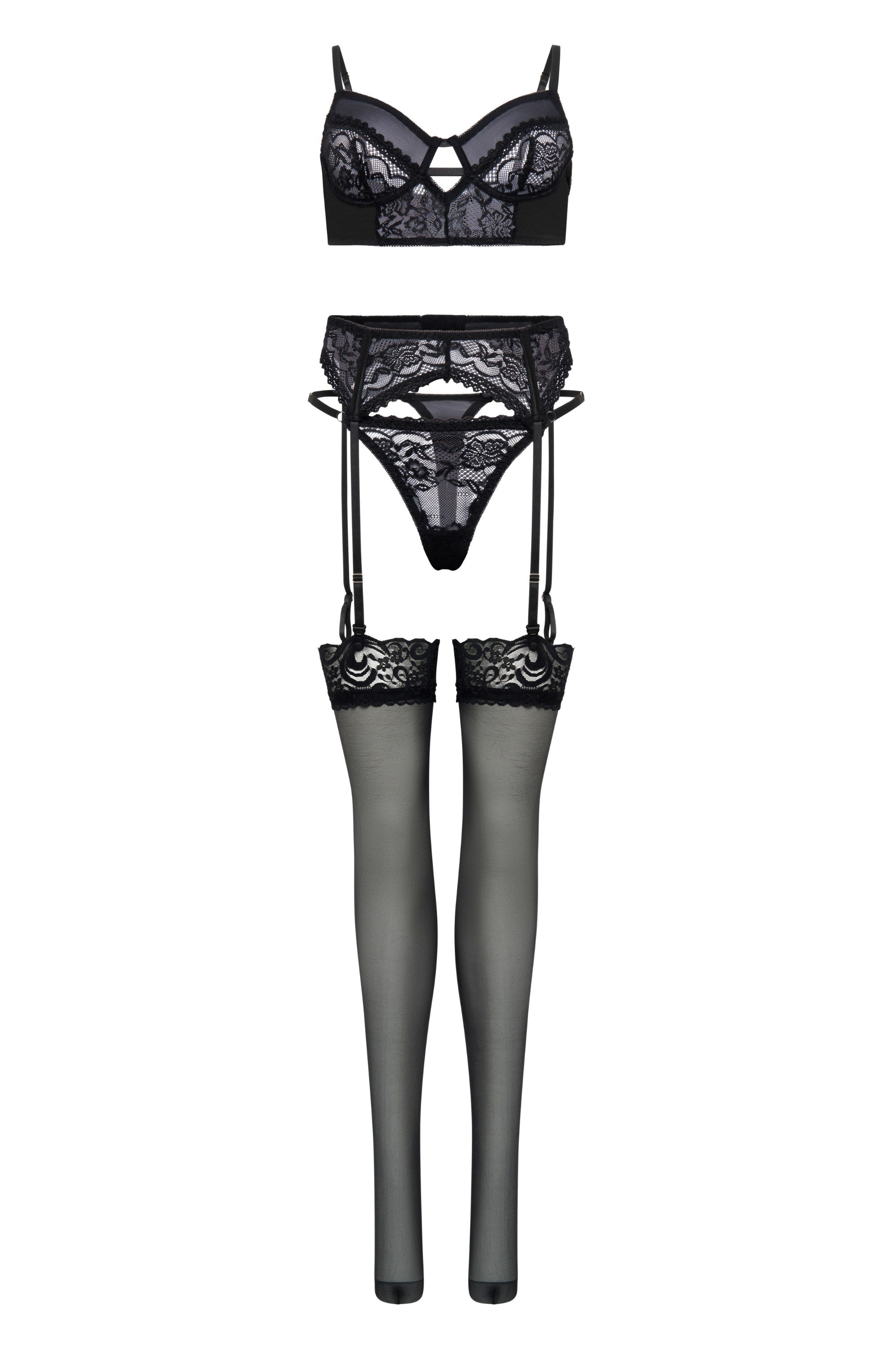 4-teiliges Spitzen-Dessous-Set mit formendem Bügel-BH, Strumpfhaltergürtel, String und feinen Strümpfen. Verstellbare Träger, weiche Materialien und perfekte Passform für besondere Anlässe – stilvolle Damen-Unterwäsche für ein sicheres Gefühl.