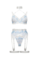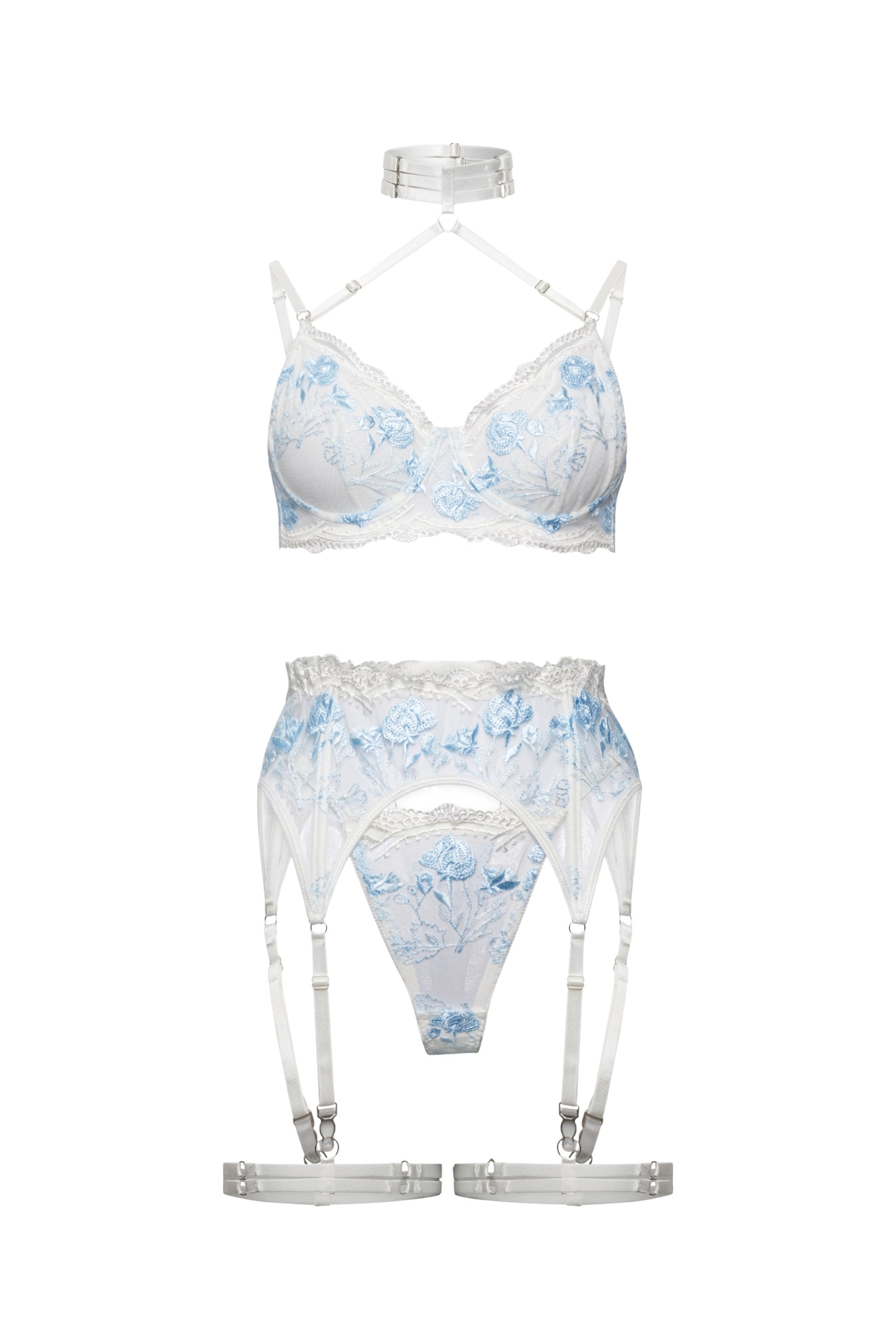 Set in Weiß mit floraler Stickerei in Blau, Mesh-Elementen und Spitze. Der Taillengürtel mit Akzentbändern wird durch String, Nackenband und Beinbänder ergänzt – clean und detailreich.