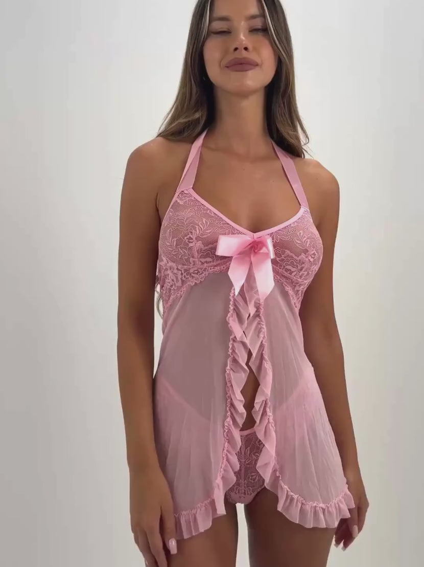 Ensemble babydoll deux pièces en maille délicate avec dentelle florale, design licou et culotte en dentelle assortie - élégant, léger et confortable pour les moments spéciaux.