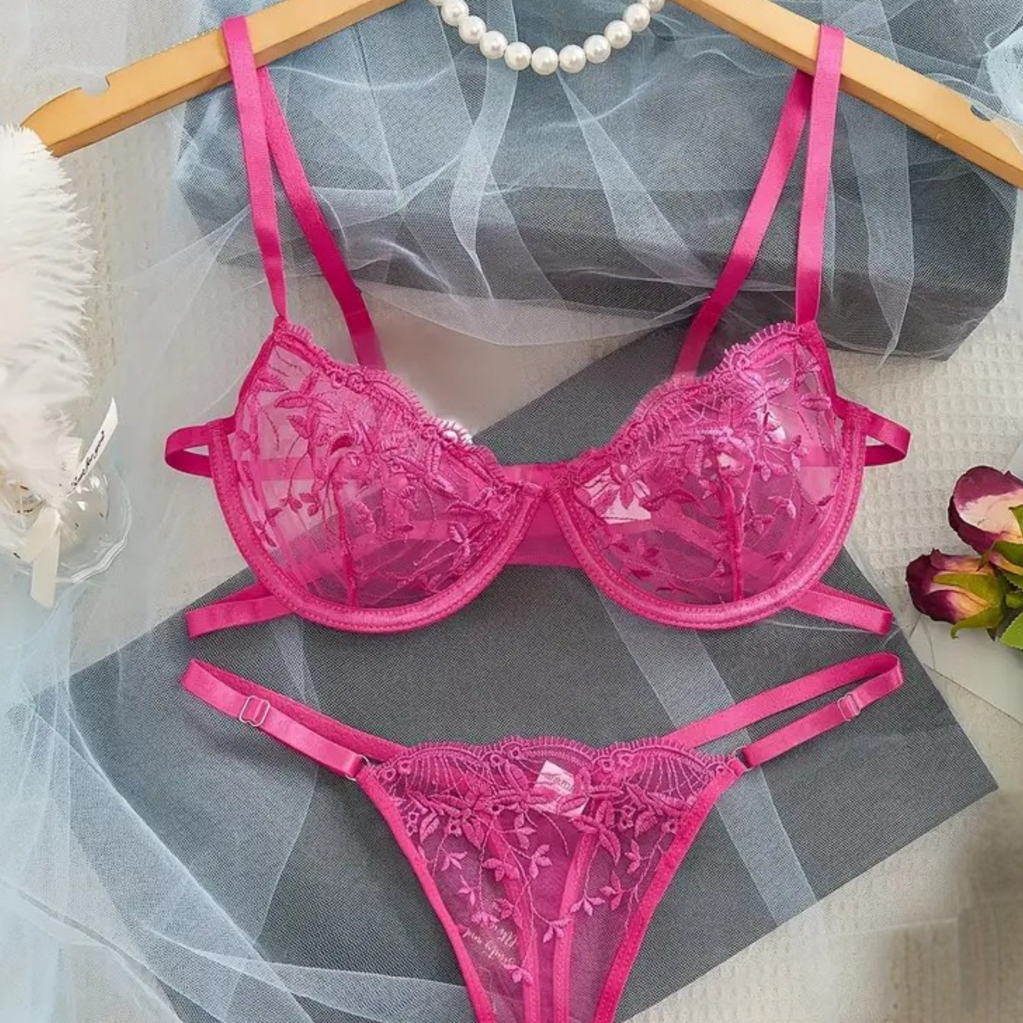 Luxueux ensemble de lingerie à armatures en dentelle florale, avec bretelles réglables et string assorti. Design élégant pour un ajustement parfait et une allure élégante.
