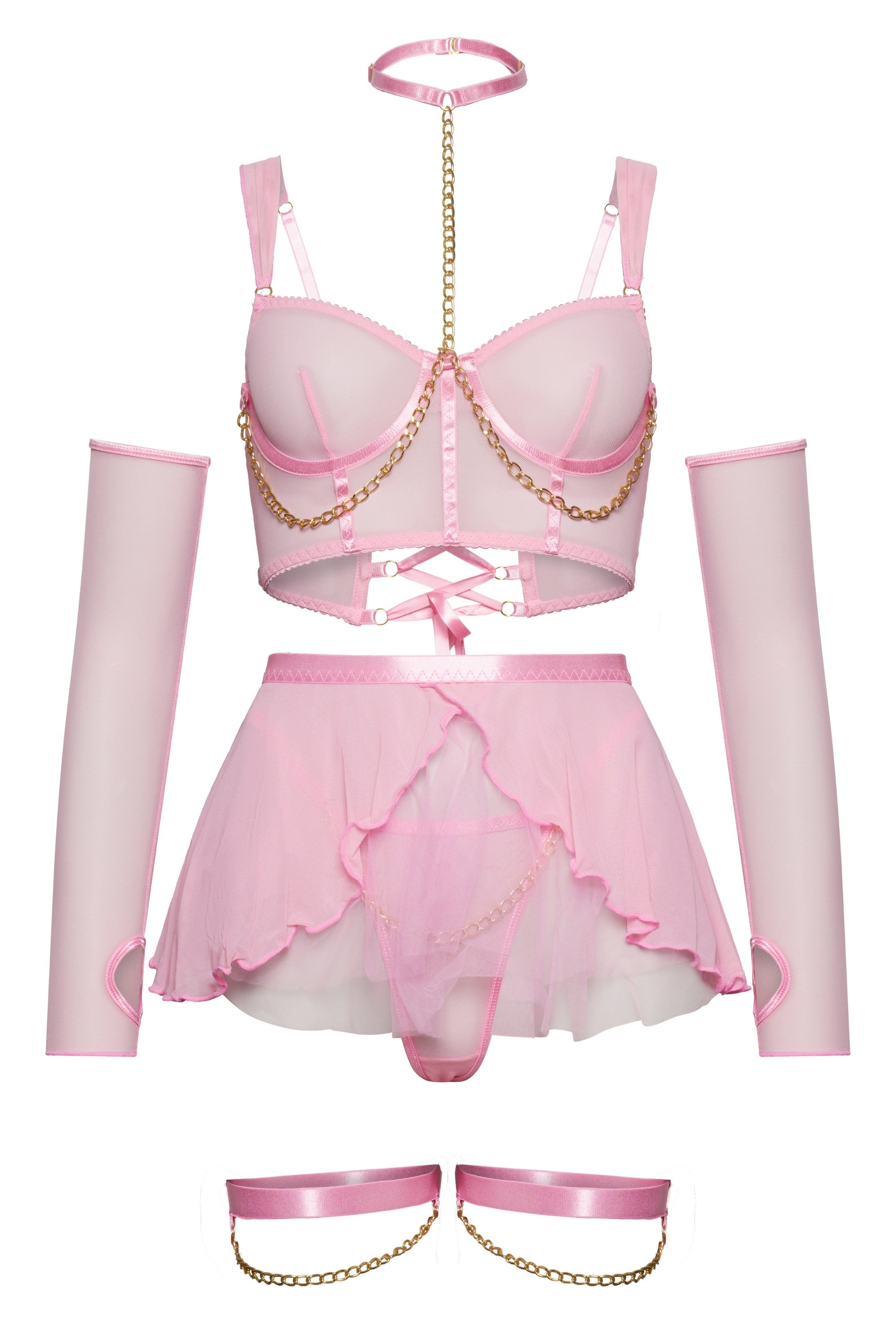 Dieses 6-teilige Dessous-Set kombiniert Bügel-BH, Ouvert-Tanga und Minirock mit feinen Ketten und Rückenschnürung. Transparentes Mesh betont die Silhouette – ideal für elegante Abende oder als besonderes Geschenk.