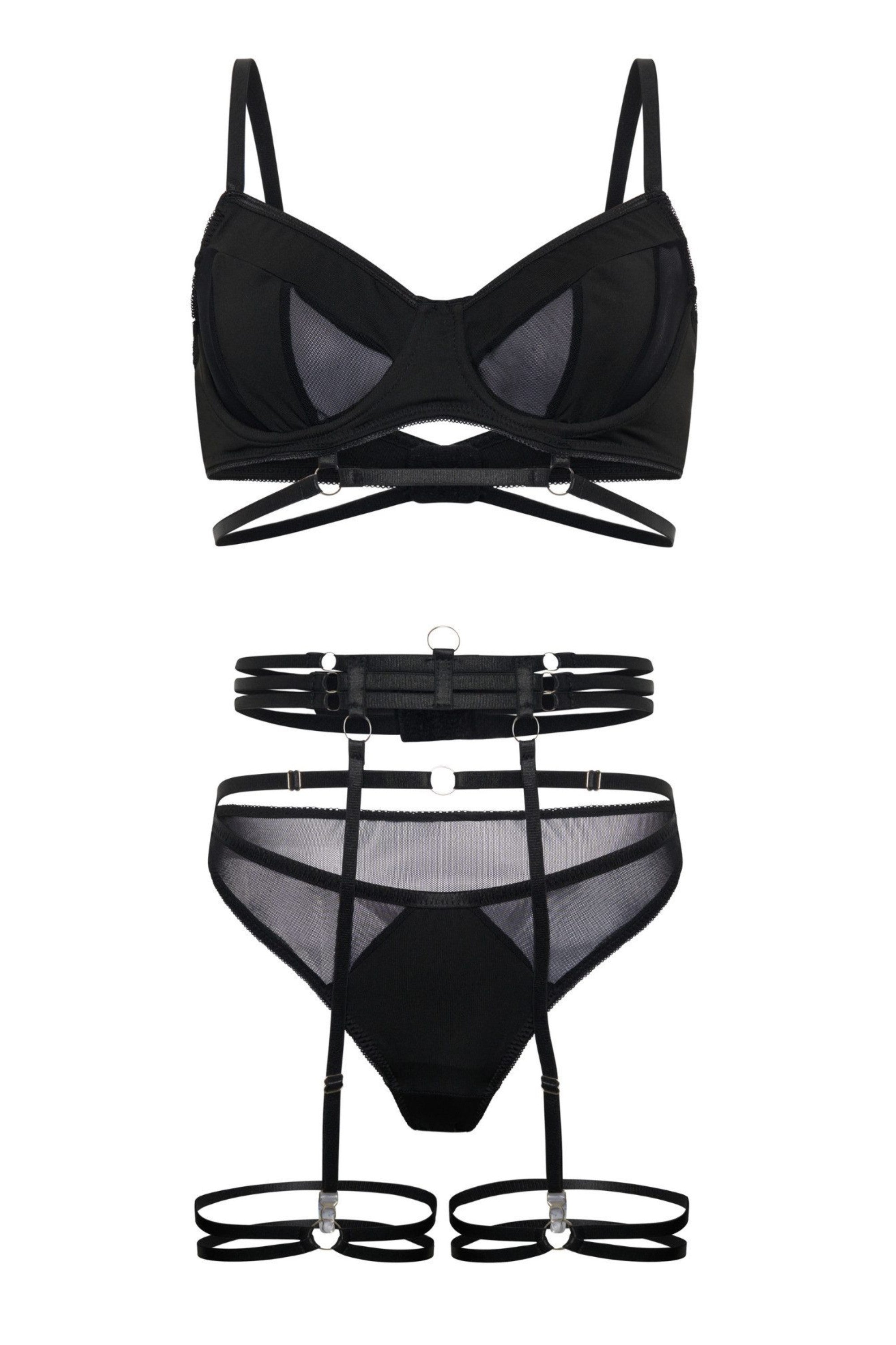 Ensemble de lingerie féminine 5 pièces comprenant un soutien-gorge à armatures, un string, un porte-jarretelles et des anneaux de cuisse. Dentelle raffinée et tissus délicats pour un confort optimal et une allure élégante – idéal pour les moments précieux.
