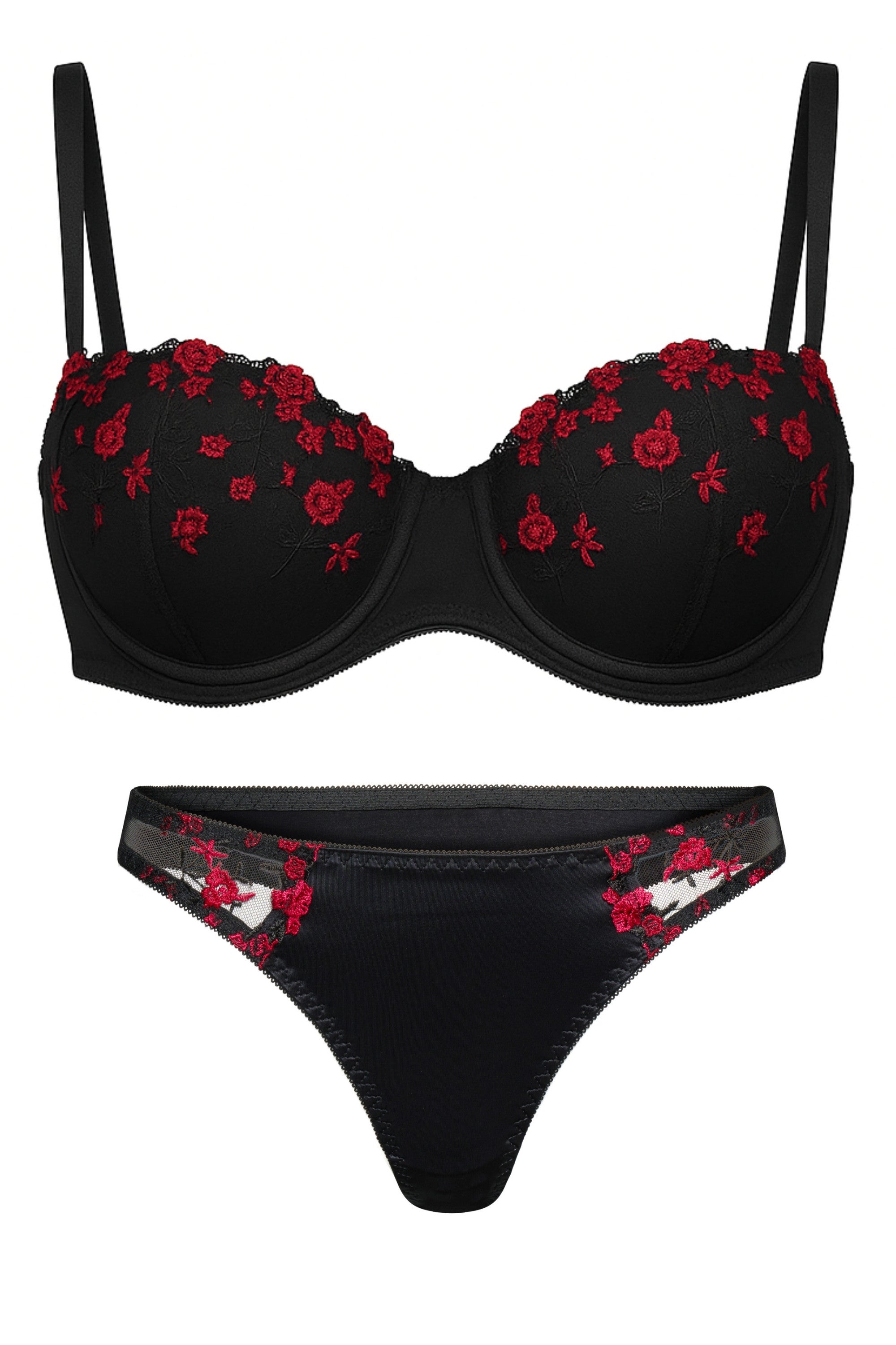 Luxuriöses Dessous-Set aus Satin und Spitze mit zarter Rosenstickerei. Der Bügel-BH formt sanft das Dekolleté, während der passende Tanga Eleganz und Komfort vereint – perfekt für stilvolle Momente.