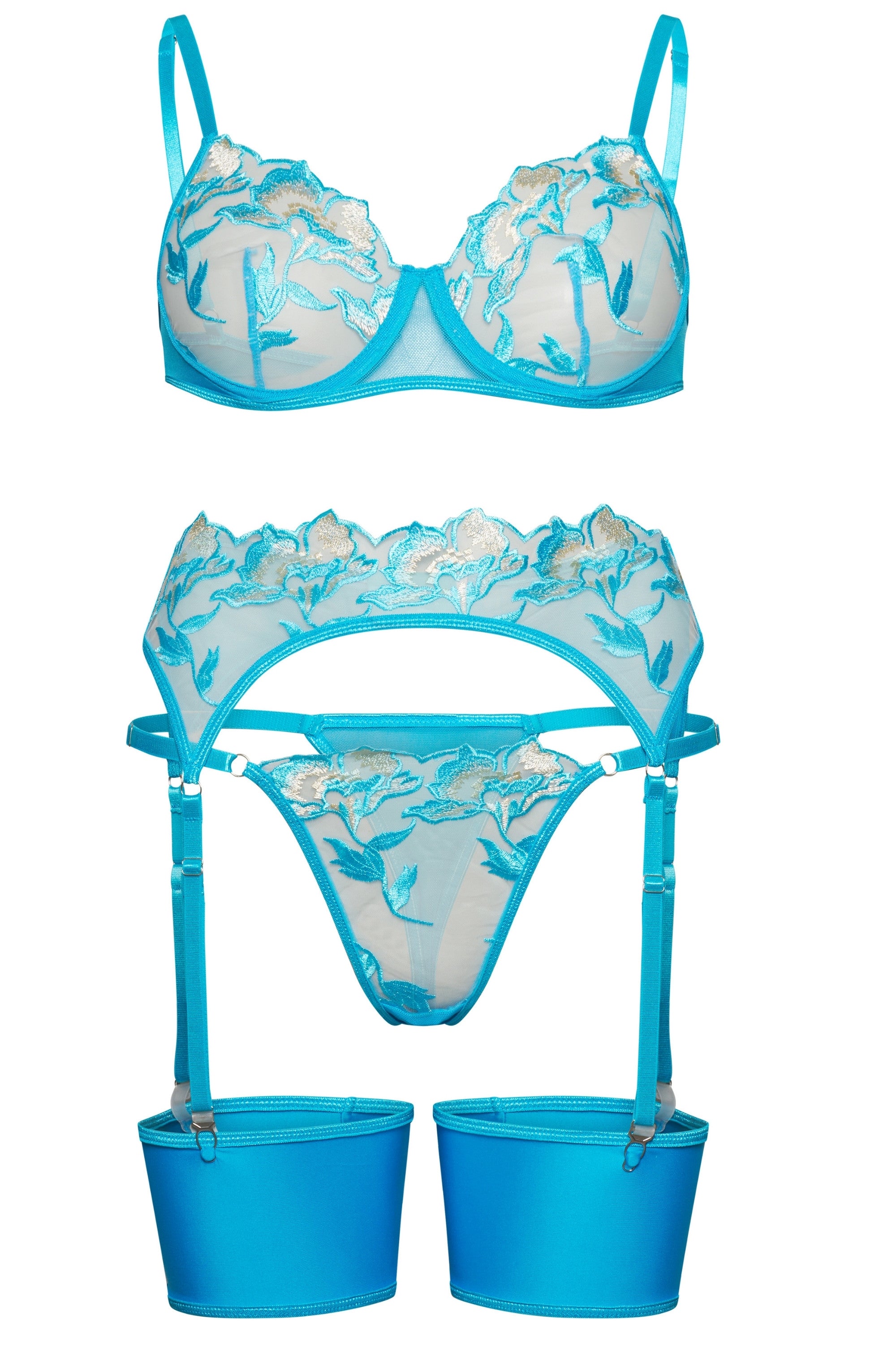 Elegantes 5-teiliges Dessous-Set mit feiner Blumenstickerei. Der Bügel-BH formt sanft, während der Tanga und Strapsgürtel mit transparenten Details feminine Akzente setzen. Ideal für stilvolle Abende und selbstbewusste Auftritte.