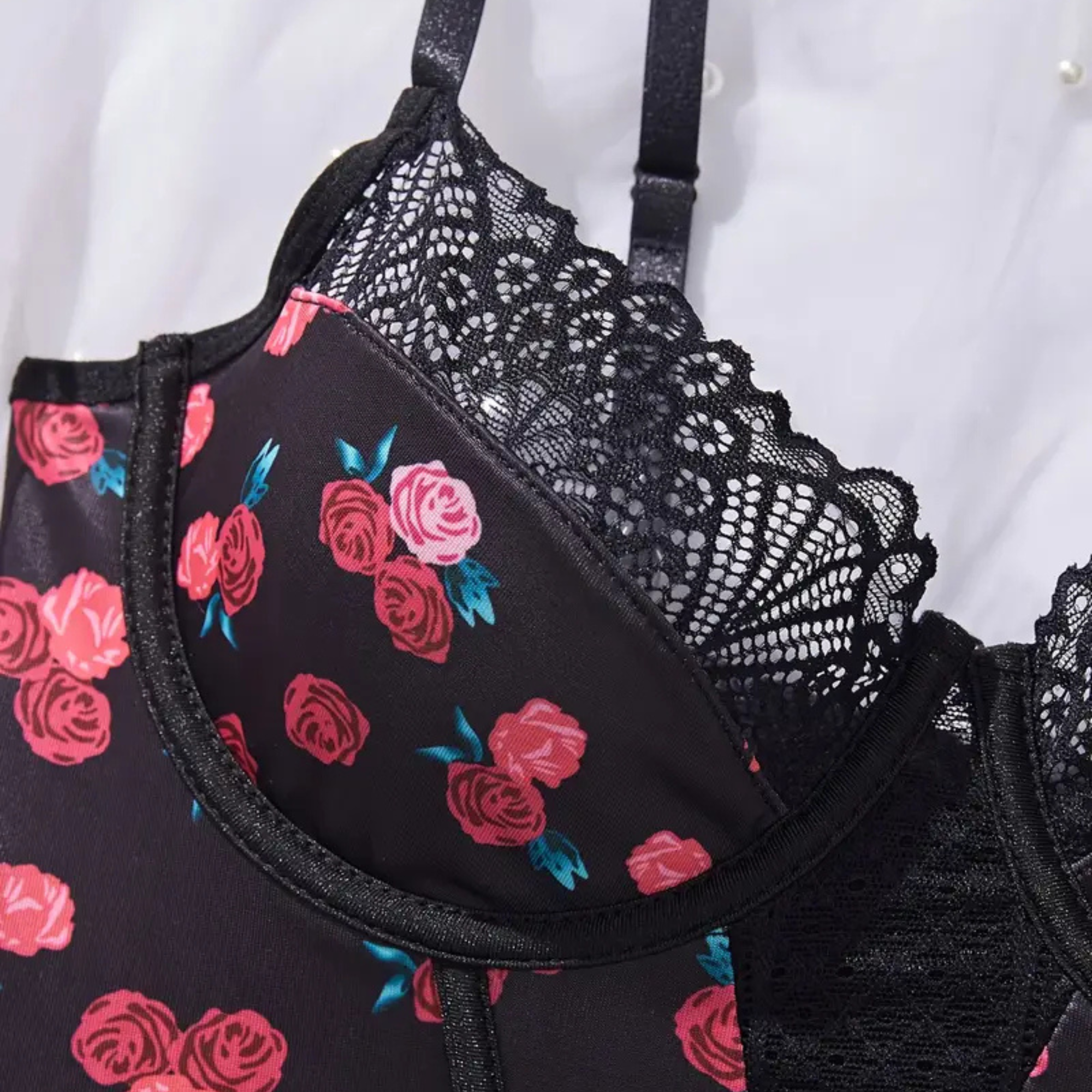 Ensemble de lingerie bustier élégant orné de broderies roses : soutien-gorge à armatures à la coupe flatteuse et string en dentelle assorti. Matières de haute qualité, coupe confortable et détails romantiques pour des moments de style.