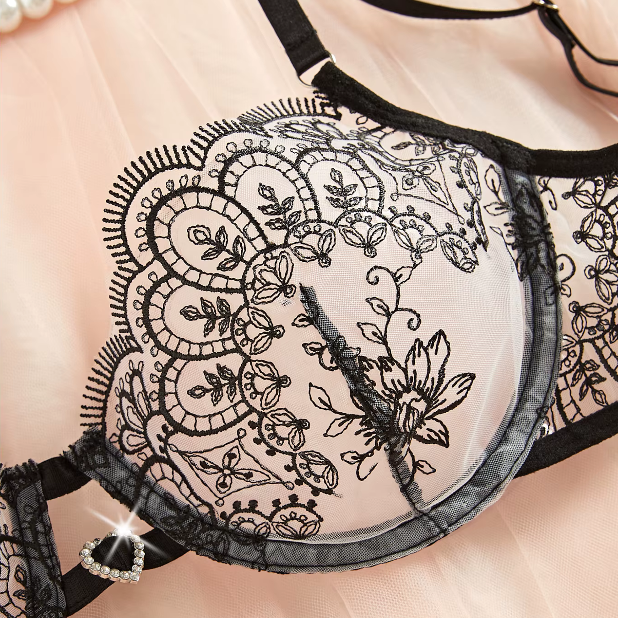 Accentuez vos courbes avec cet ensemble de lingerie séduisant ! Le soutien-gorge push-up avec rembourrage renforcé crée un décolleté à couper le souffle, tandis que la maille transparente et la broderie ajoutent du luxe. Le string en tulle assorti offre confort et élégance – parfait pour les occasions spéciales.
