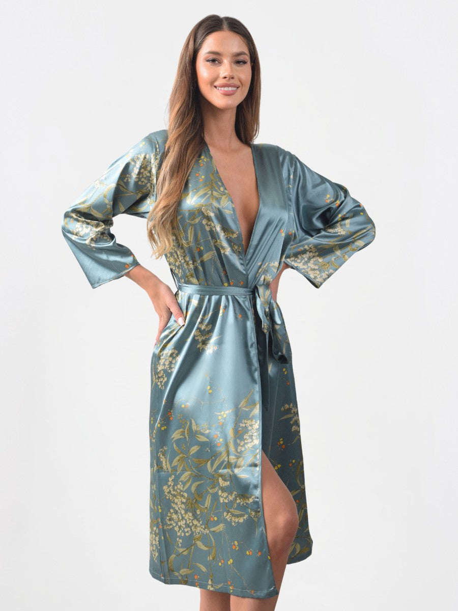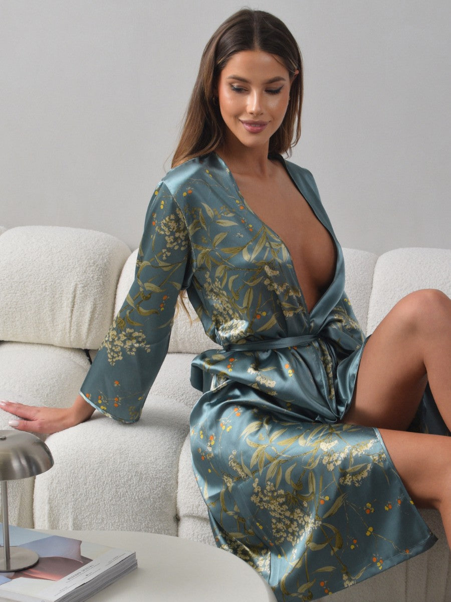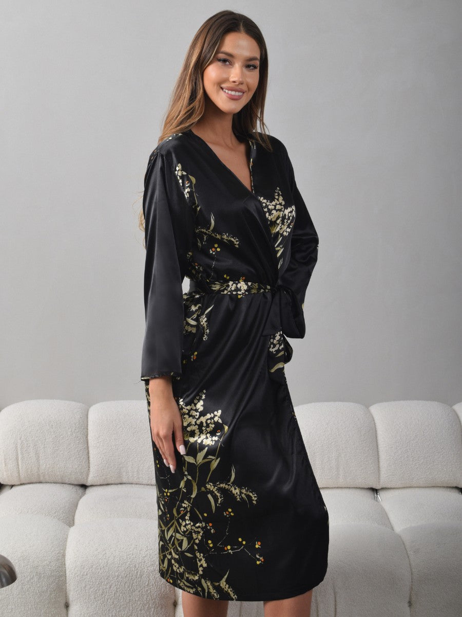 Gönnen Sie sich pure Eleganz mit diesem Satin-Negligee im Blumenmuster-Design. Der Langarm-Kimono mit tiefem V-Ausschnitt und Gürtel umspielt Ihre Figur stilvoll und bietet höchsten Komfort. Perfekt für entspannte Abende und besondere Momente.